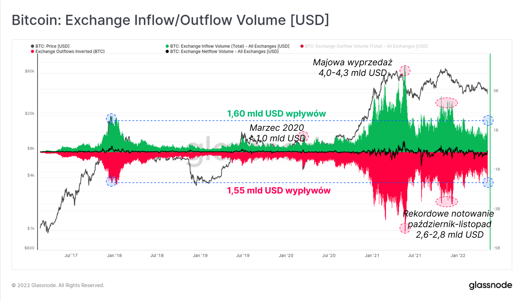Podczas wyprzedaży w ubiegłym tygodniu, środki o łącznej wartości ponad 3,15 mld USD wpłynęły na lub wypłynęły z giełd, z nadwyżką netto wpływów, których wartość stanowiła 1,60 mld USD (50,8%). Jest to największy łączny wolumen powiązany z wpływami na/z giełd, odkąd zanotowaliśmy rekordowe notowanie BTC (ATH) w październiku-listopadzie ubiegłego roku. Stanowi to także równowartość wpływów/wypływów notowanych podczas szczytu hossy w 2017 roku.