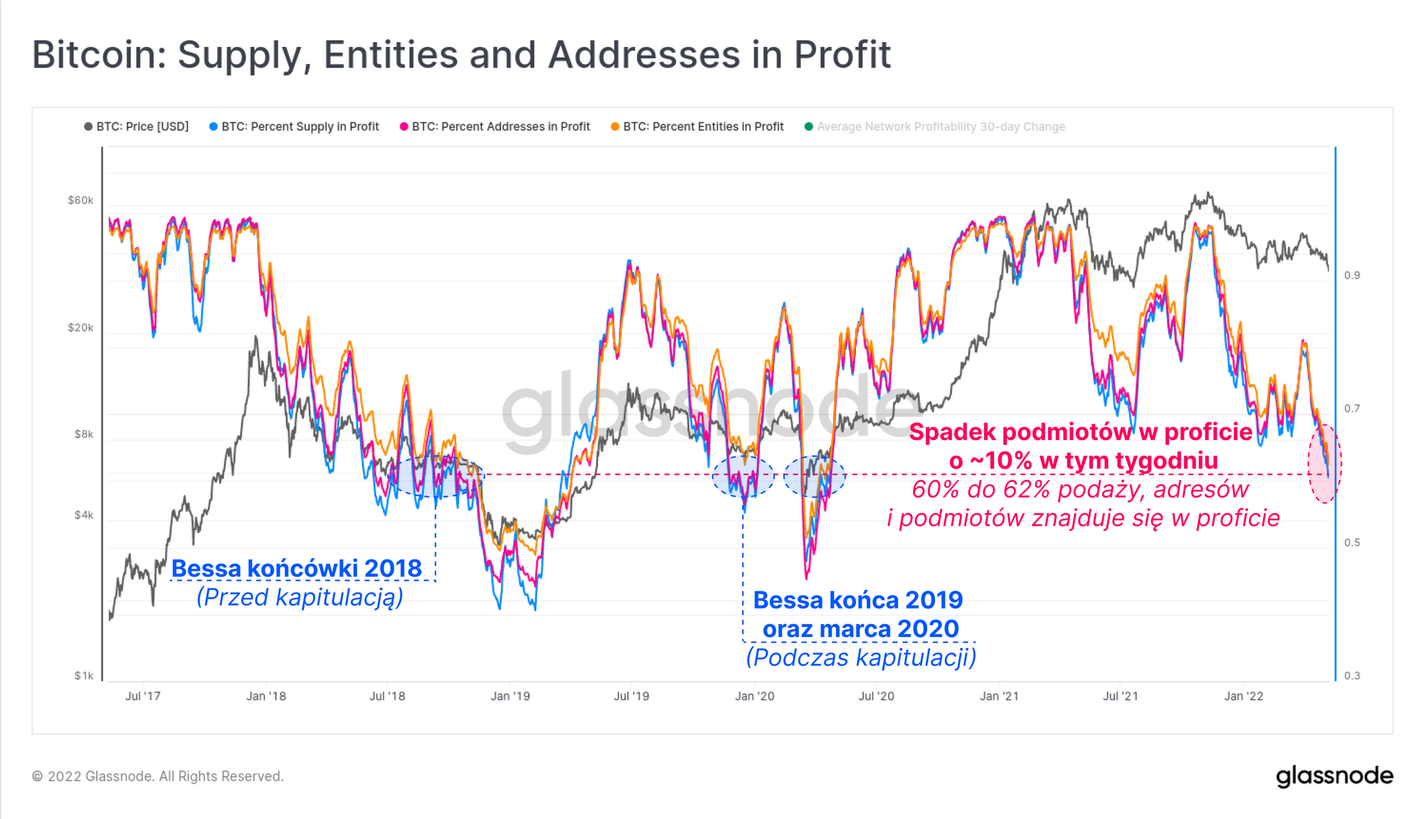 Wraz ze spadkiem cen do 33 800$, odnotowaliśmy w głównej mierze realizację tego scenariusza, a dodatkowe 10% społeczności Bitcoina rzeczywiście zostało zepchnięte w niezrealizowane straty. Wszystkie 3 metryki skurczyły się z okolic 72% inwestorów w proficie do 60-62%. Poziomy te pokrywają się z zyskownością obserwowaną pod koniec 2018 roku oraz z końcówką bessy lat 2019-2020. Należy jednak zauważyć, iż oba te przypadki miały miejsce przed ostateczną kapitulacją.