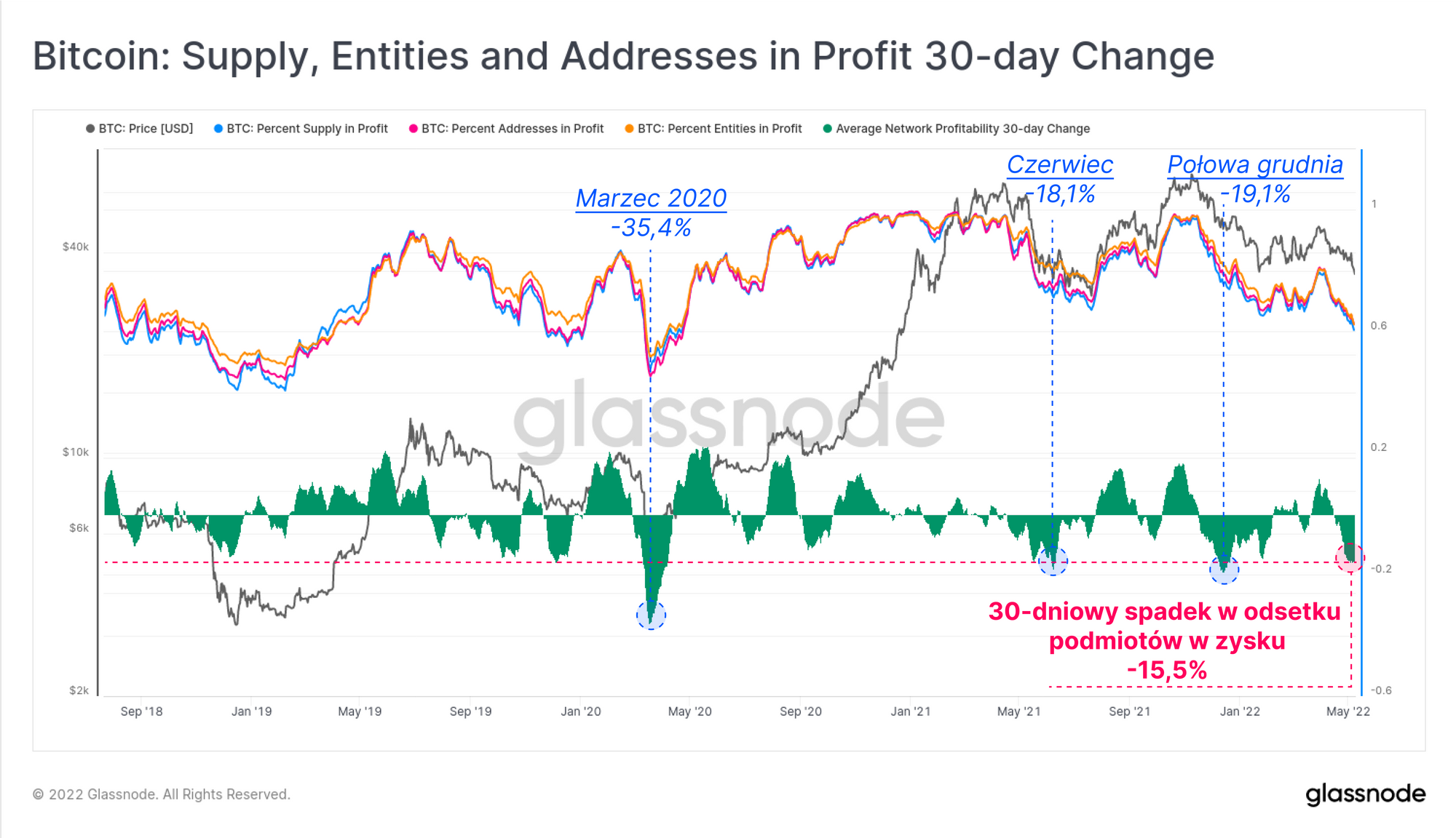 Biorąc pod uwagę, iż te trzy wskaźniki poruszają się razem, możemy obliczyć prostą zmianę średniej zyskowności podmiotów w sieci w ciągu 30 dni. Daje nam to wskazówkę dotyczącą tempa zmian „stresu finansowego” inwestorów Bitcoina. W ciągu ostatniego miesiąca, odsetek inwestorów Bitcoina, którzy wpadli w niezrealizowaną stratę, wynosi średnio 15,5%.