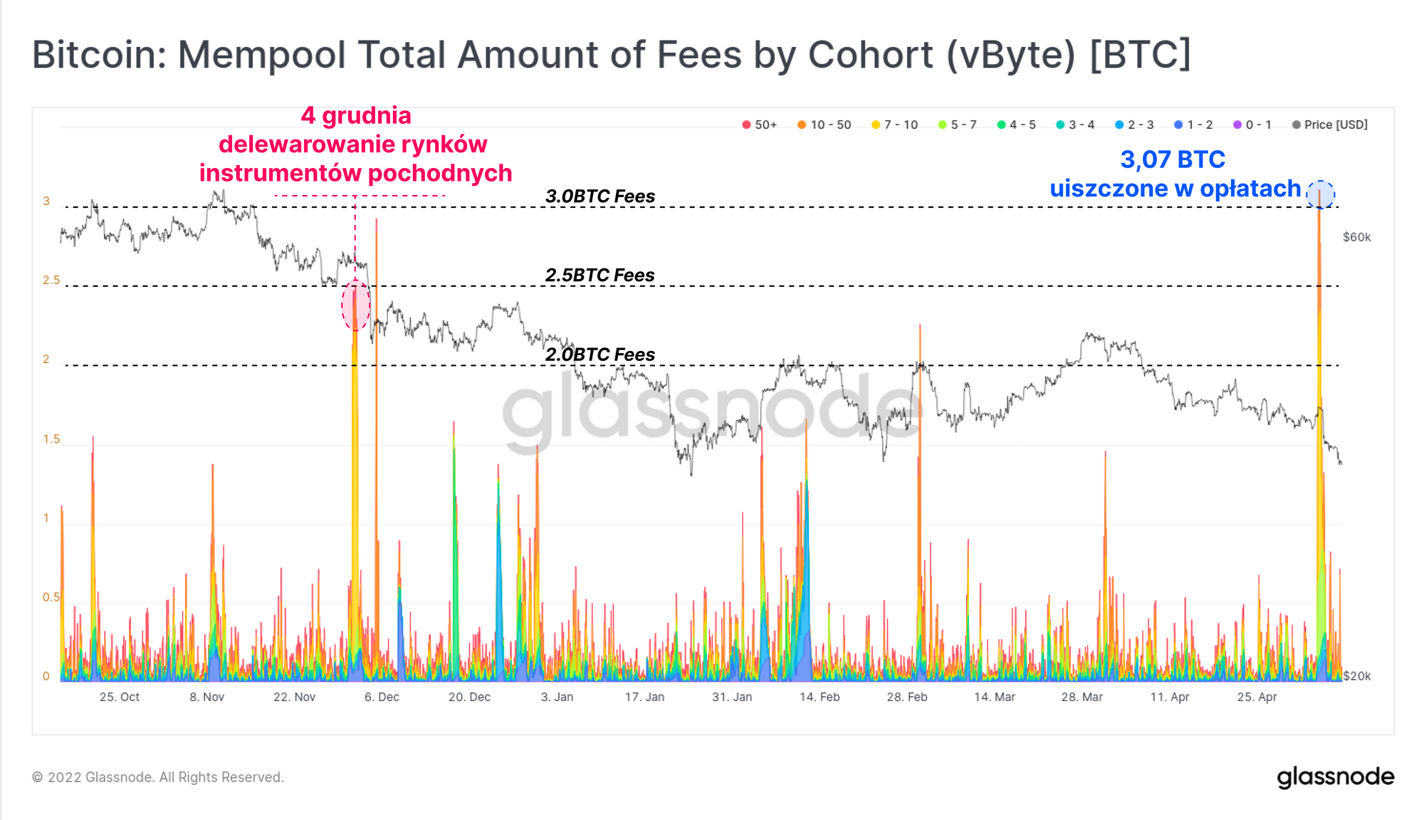 Możemy także zauważyć, iż transakcje te posiadały bardzo wysoki poziom priorytetowości, gdyż łączna wartość wszystkich zapłaconych opłat przesyłowych on-chain osiągnęła 3,07 BTC. Stanowi to wartość wyższą niż podczas delewarowania rynków instrumentów pochodnych 4 grudnia, kiedy to notowania zanotowały spadek o 34,5% w ciągu jednego dnia (omówione w newsletterze z 49 tygodnia 2021) i jest to także ponownie największa wartość w naszym dotychczasowym zestawieniu danych.