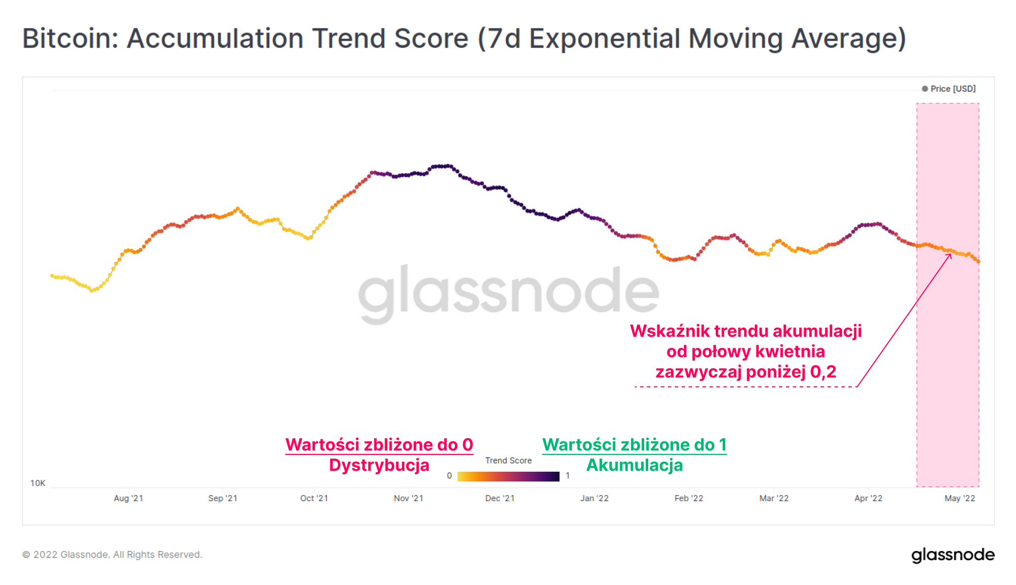Wskaźnik trendu akumulacji Bitcoina zanotował znacznie łagodniejszy miesiąc, pokazując wartości poniżej 0,2 od połowy kwietnia. Generalnie sygnalizuje to zachowanie nastawione na dystrybucję i mniejszą akumulację, co zbiega się w czasie ze słabszymi warunkami rynkowymi.