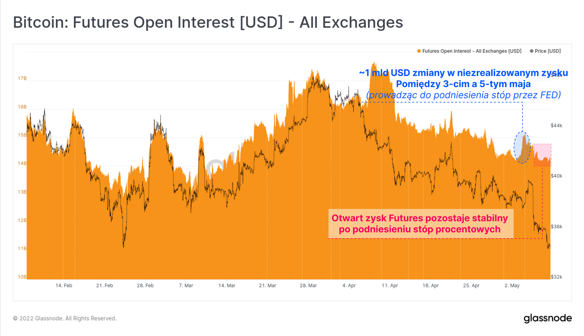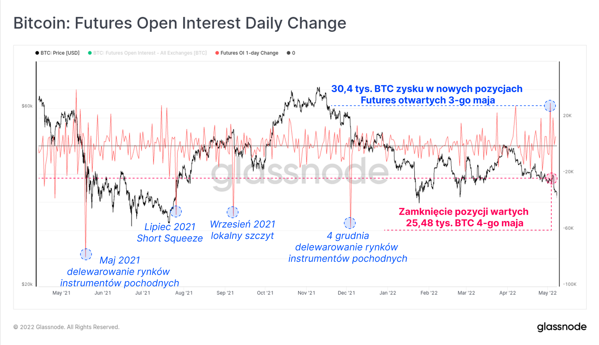 Zauważyć możemy drastyczną zmianę w jednodniowym wykresie niezrealizowanego zysku na rynkach Futures, co związane było ze wspomnianym wcześniej wystąpieniem Rezerwy Federalnej. Otwarty zysk zwiększył się w sumie o 30,4 tys. BTC w dniu 3 maja, po czym 25,48 tys. BTC z tego zysku zostało zamknięte następnego dnia.