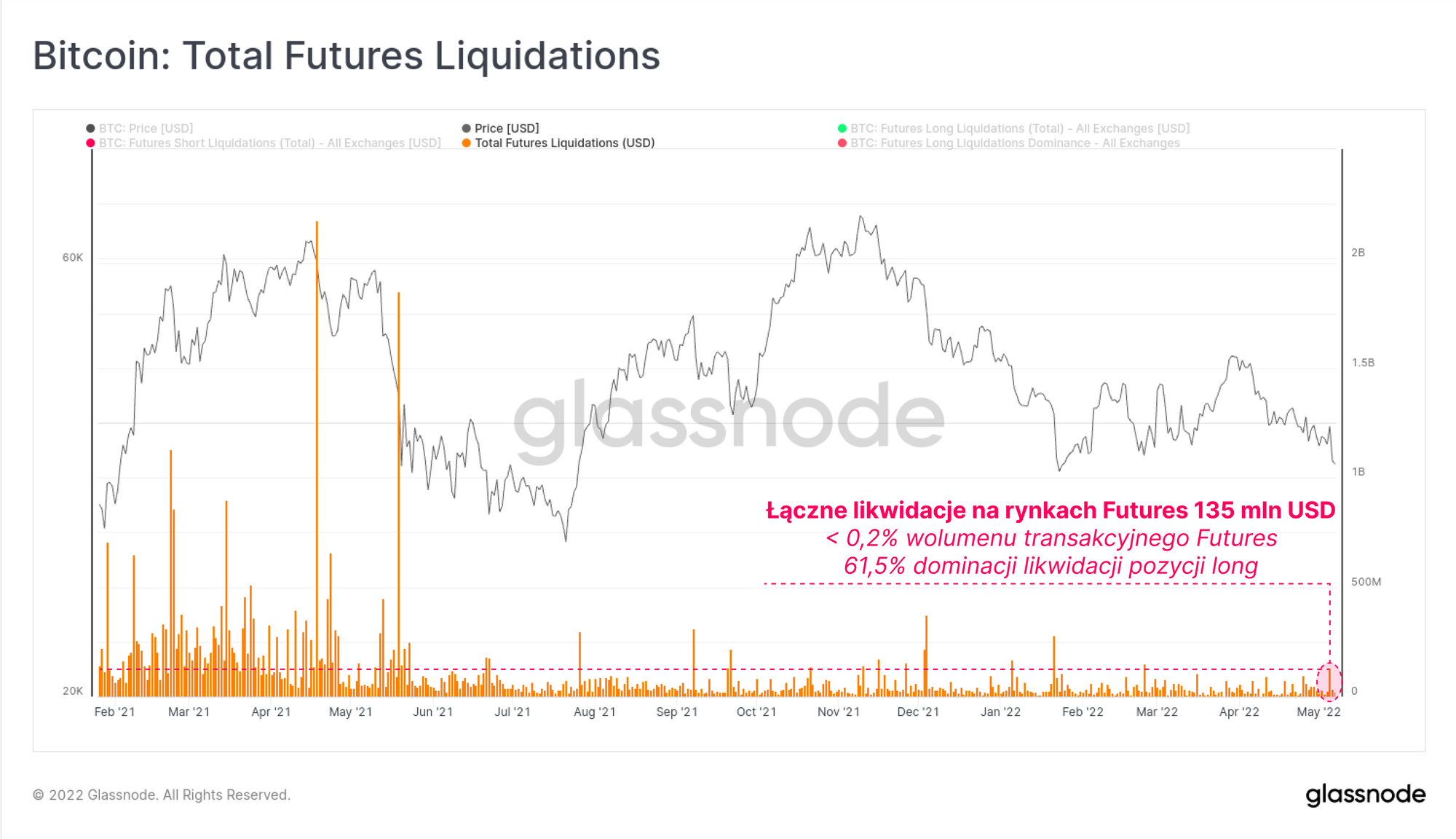 Jednakże w tym tygodniu w szczytowym momencie wyprzedaży, maksymalna wartość zlikwidowanych pozycji futures wynosiła 135 mln USD. Stanowi to mniej niż 0,2% wolumenu obrotu kontraktami futures. Zgodnie z oczekiwaniami, największe straty poniosły pozycje long (wzrostowe), które stanowiły 61,5% zlikwidowanych pozycji. Ogólnie rzecz ujmując, wydaje się, iż słabość notowań wynika z negatywnego sentymentu inwestorów, odpływu kapitału oraz obniżania ryzyka, a nie likwidacji pozycji na rynkach futures.