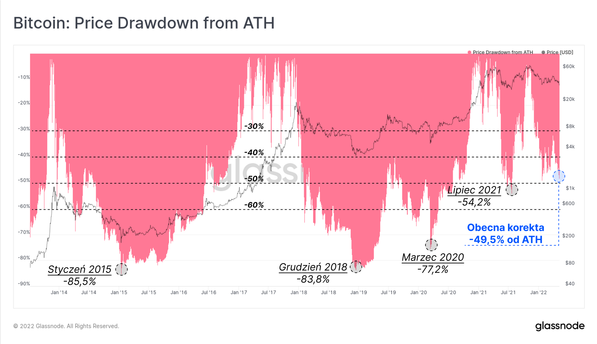 Chociaż jest to znaczący spadek, jest on nadal stosunkowo skromny względem ostatecznych dołków z poprzednich bess. Spadek notowań w lipcu 2021 osiągnął poziom -54,2% od szczytu, a bessy w 2015, 2018 i marcu 2020 roku kapitulowały na poziomach między -77,2% a -85,5% od ówczesnego szczytu.