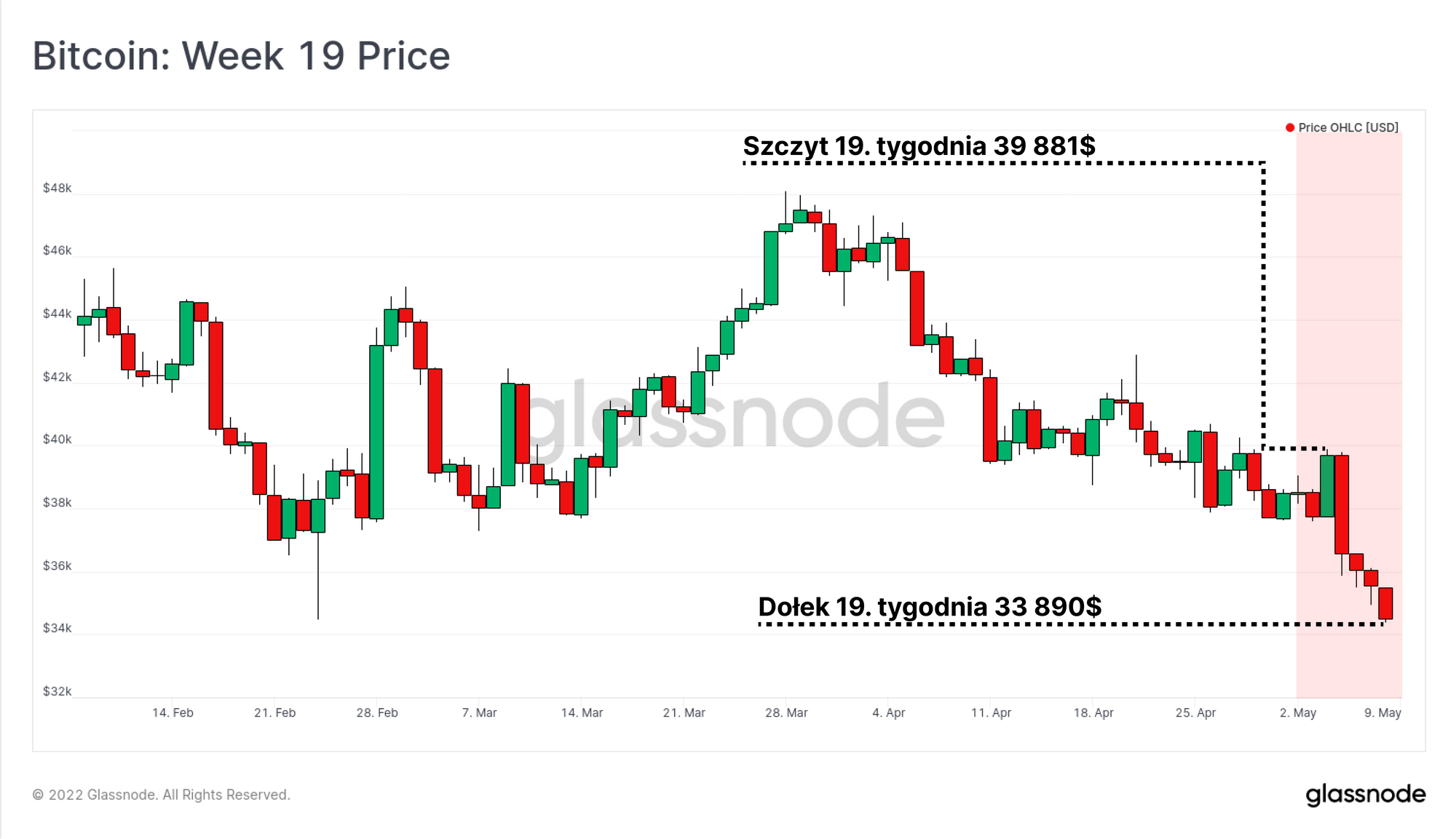 W tym tygodniu rynki finansowe doświadczyły dużej zmienności oraz dalszych spadków, co stanowiło swoistą odpowiedź na decyzję Rezerwy Federalnej o podniesieniu stóp procentowych o 0,5%. Początkowo, w środę, rynki zniosły tę decyzję całkiem dobrze, a sam Bitcoin poszybował do 39 881$, co stanowiło szczyt ubiegłotygodniowych notowań. Jednakże pozytywne momentum nie trwało długo, doprowadzając do silnej wyprzedaży w czwartek i powodując spadek notowań Bitcoina o 13,8%, w konsekwencji zamykając tydzień na poziomie 33 800$.