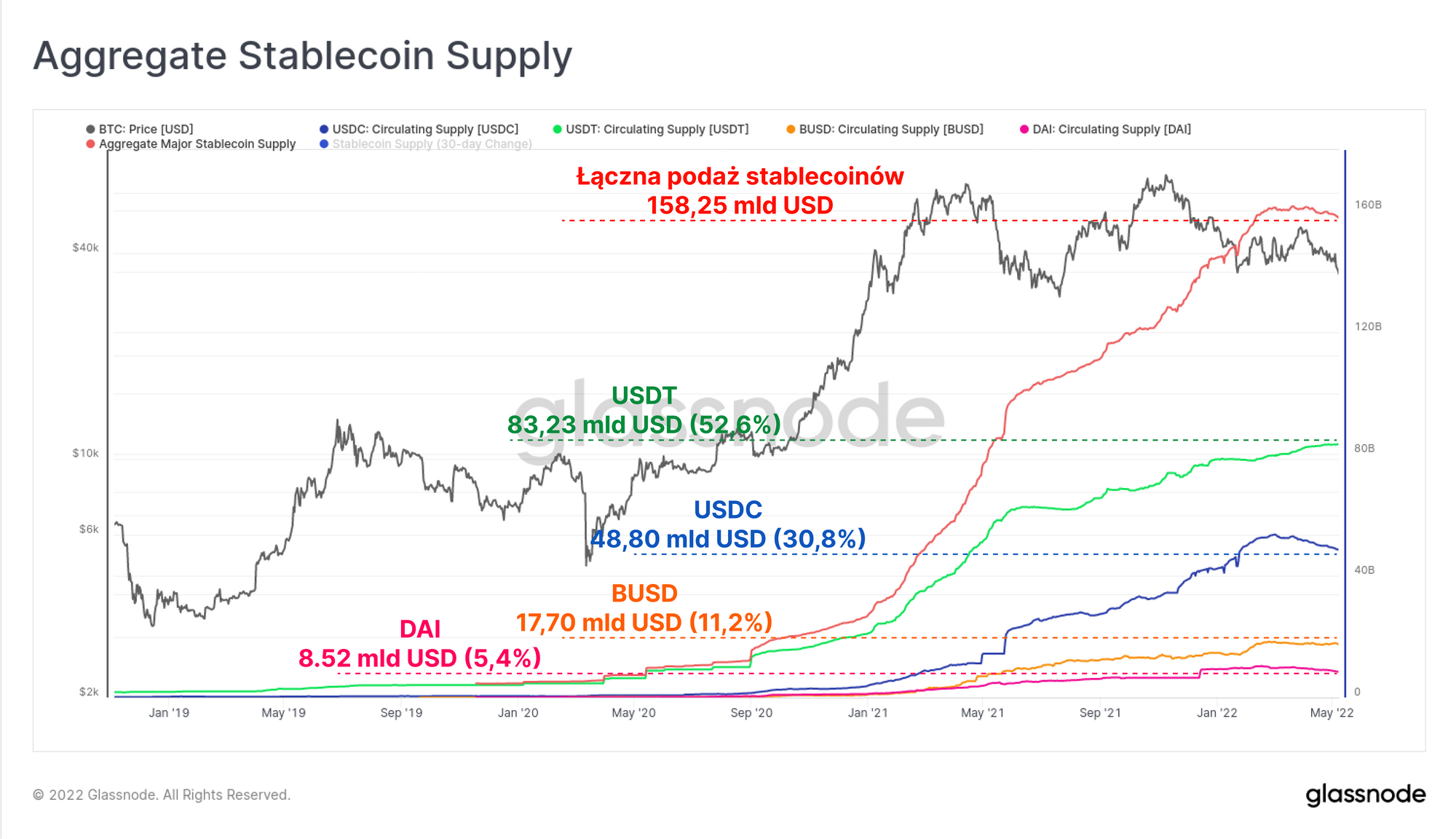 Od wyprzedaży z marca 2020 roku, łączna podaż głównych stablecoinów (USDT, USDC, BUSD oraz DAI) wzrosła z 5,33 mld USD do ponad 158,25 mld USD. Jest to zaskakujący wzrost o 2866% w ciągu nieco ponad dwóch lat. USDT nadal pozostaje dominującym aktywem, stanowiąc 52,6% głównej podaży, za nim plasuje się USDC, którego dominacja wynosi 30,8% rynku.