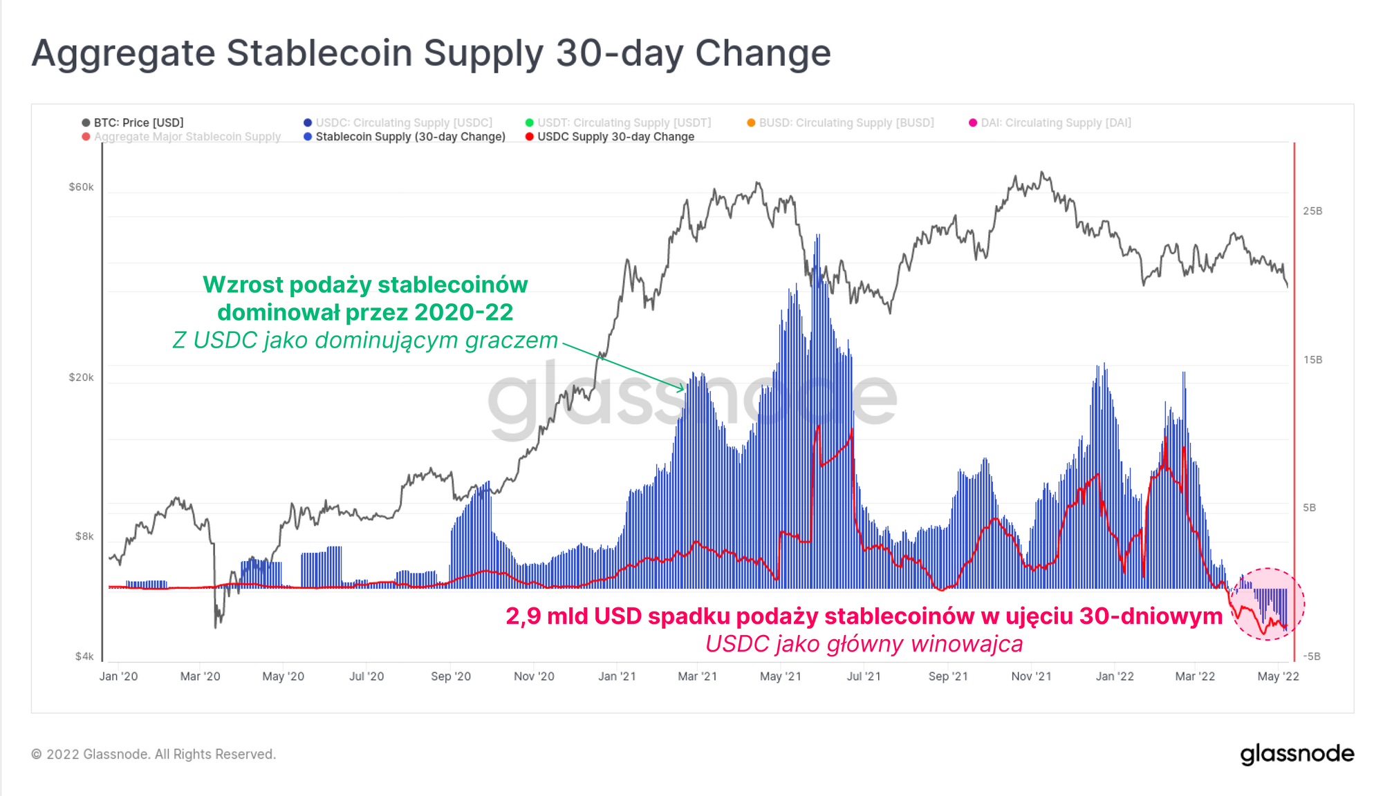 Zauważalnym jest, iż szczególnie od maja 2021 roku USDC był głównym motorem napędowym ogólnego wzrostu podaży stablecoinów. Możemy także zauważyć, iż ostatnie skurczenie się podaży stablecoinów jest niezwykle rzadkim wydarzeniem, a całkowity spadek podaży osiąga poziom -2,9 mld USD na miesiąc. USDC jest głównym stablecoinem, który podlega odkupowaniu, co wskazuje, że odpływ kapitału z branży kryptowalut jest znaczący.