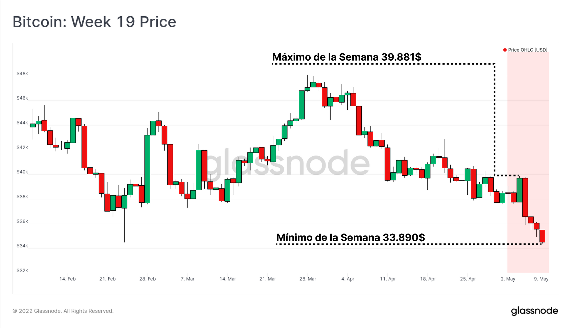 Esta semana los mercados han sufrido alta volatilidad y más recorrido bajista, todo apunta a que es una respuesta del mercado ante la decisión de la Reserva Federal de subir los tipos de interés un 0,5%. Inicialmente la respuesta fue buena cuando se conocía por primera vez la noticia el miércoles, haciendo incluso que Bitcoin se propulsase hasta el máximo semanal de 39.881$. No obstante, la inercia alcista no llegó muy lejos, y los mercados terminaron por desplomarse con fuerza el jueves, empujando a Bitcoin un -13,8% en caída hasta los 33.890$.
