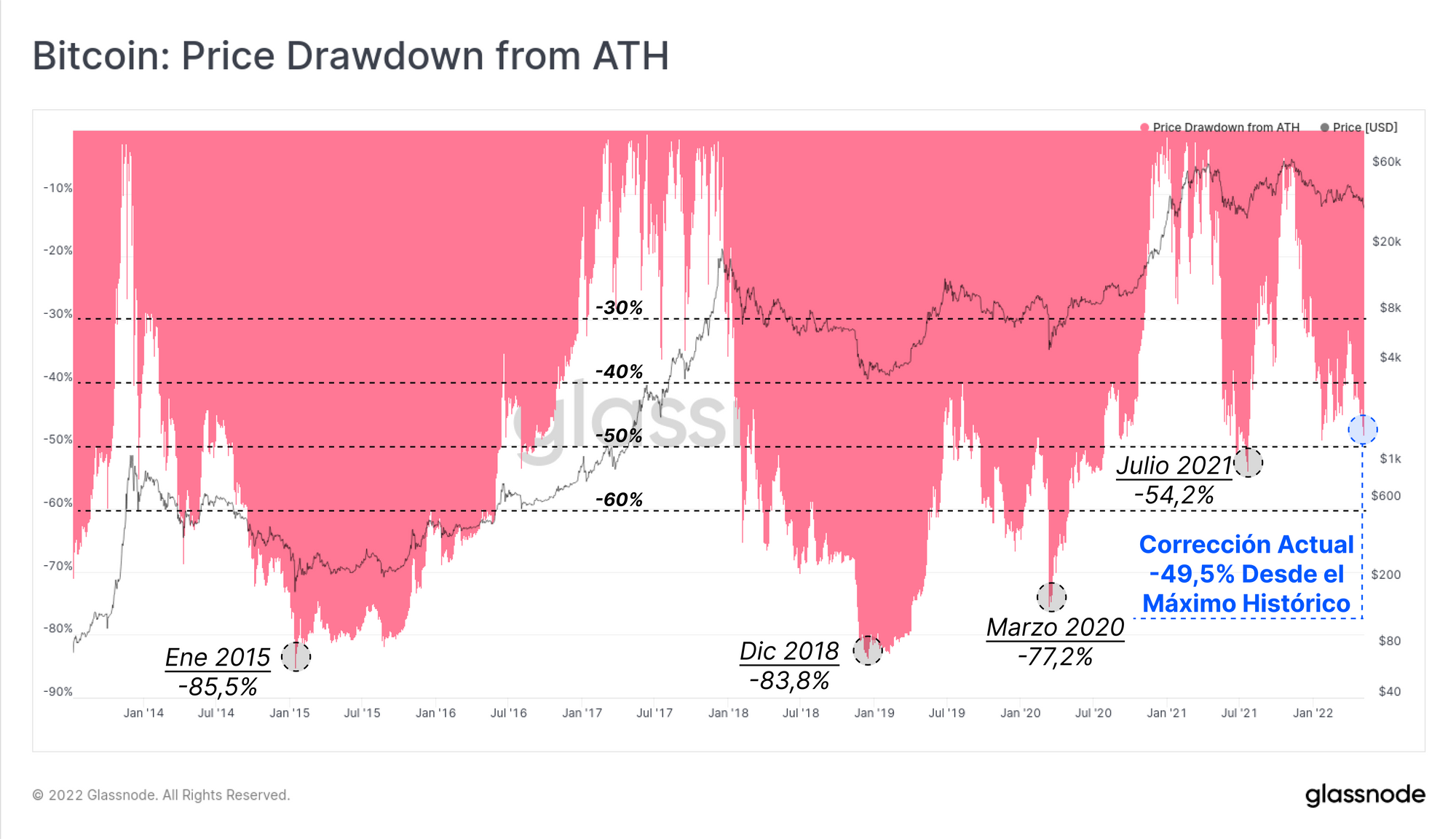 Aunque representa un retroceso significativo, sigue siendo algo modesto cuando lo comparamos con los mínimos que se imprimieron en los anteriores mercados bajistas de Bitcoin. en julio del pasado 2021 llegamos al -54,2% de corrección, y los mercados bajistas del 2015, 2018 y marzo del 2020 alcanzaron capitulaciones en sus mínimos del -77,2% y el 85,5% desde el Máximo Histórico del momento.