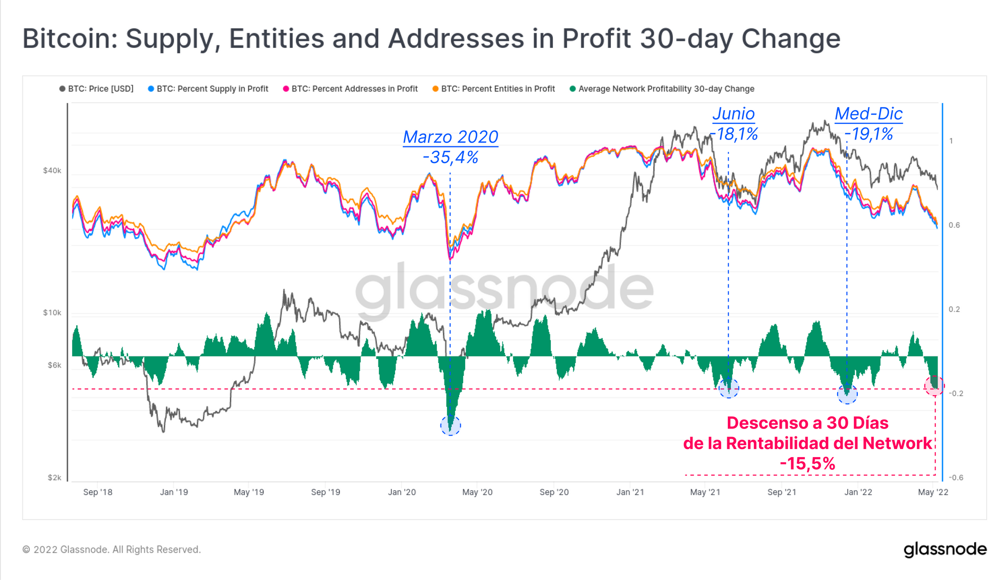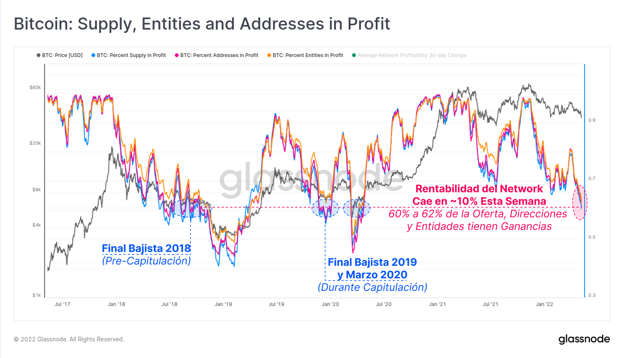 Ya que esta semana los precios han descendido hasta los 33.800$, hemos visto cómo este escenario se ha desarrollado en gran medida, y efectivamente un 10% adicional del network de Bitcoin se ha sumergido en pérdidas no realizadas. Las 3 métricas que trabajamos han disminuido desde un ~72% hasta entre el 60% y el 62% en ganancias. Son niveles que coinciden con la rentabilidad que teníamos durante los mercados bajistas de finales del 2018, y 2019-20. Aunque hay que tener en cuenta que en ambas instancias se producía antes del evento de capitulación y purga final.