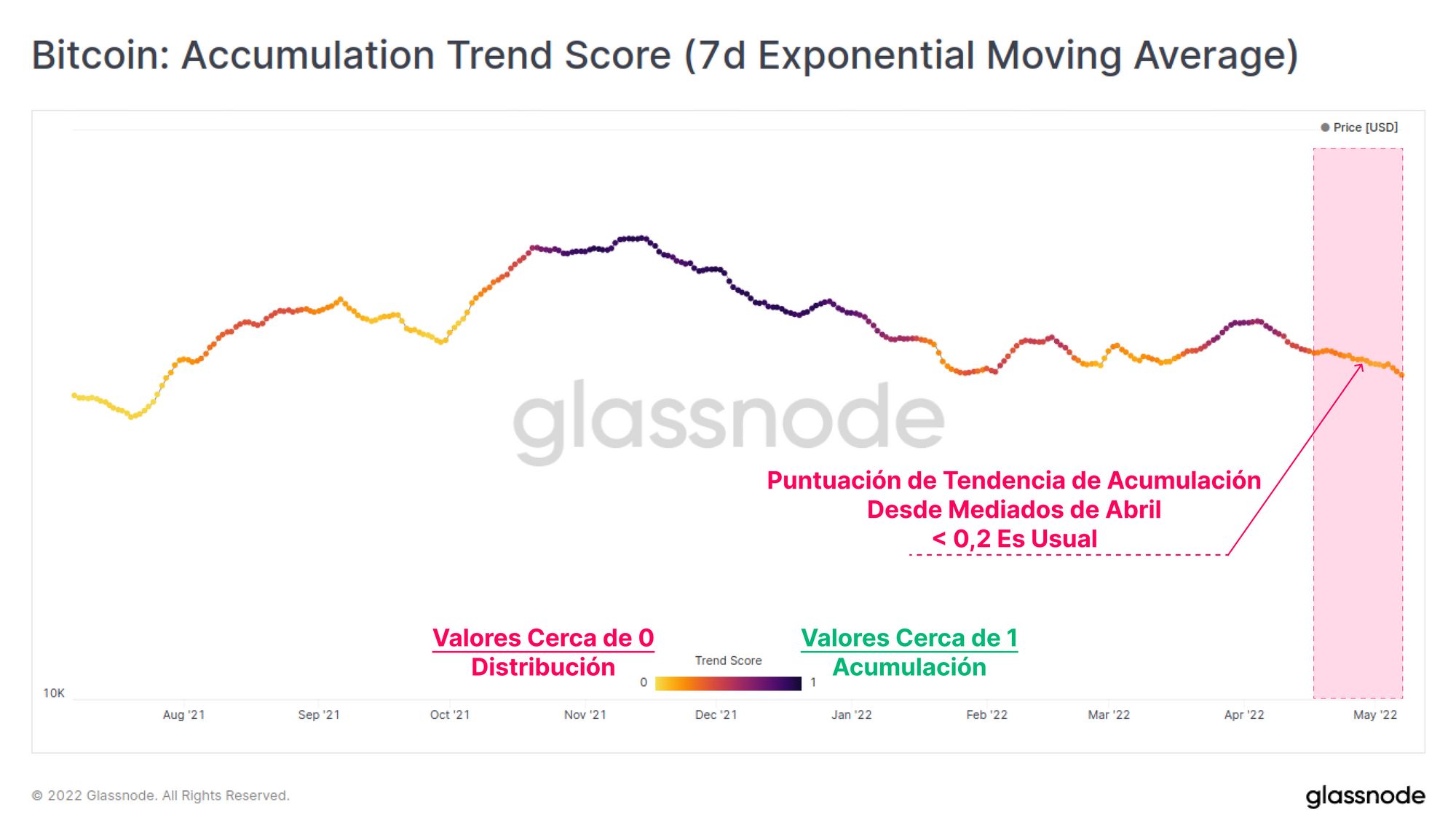 El indicador de tendencia de acumulación de Bitcoin se ha suavizado considerablemente este mes, imprimiendo valores de menos del 0,2 desde mediados de abril. Generalmente esto indica que hay vigente un comportamiento mucho más distributivo, con menos acumulación en marcha, y suele coincidir con precios más débiles en el mercado.