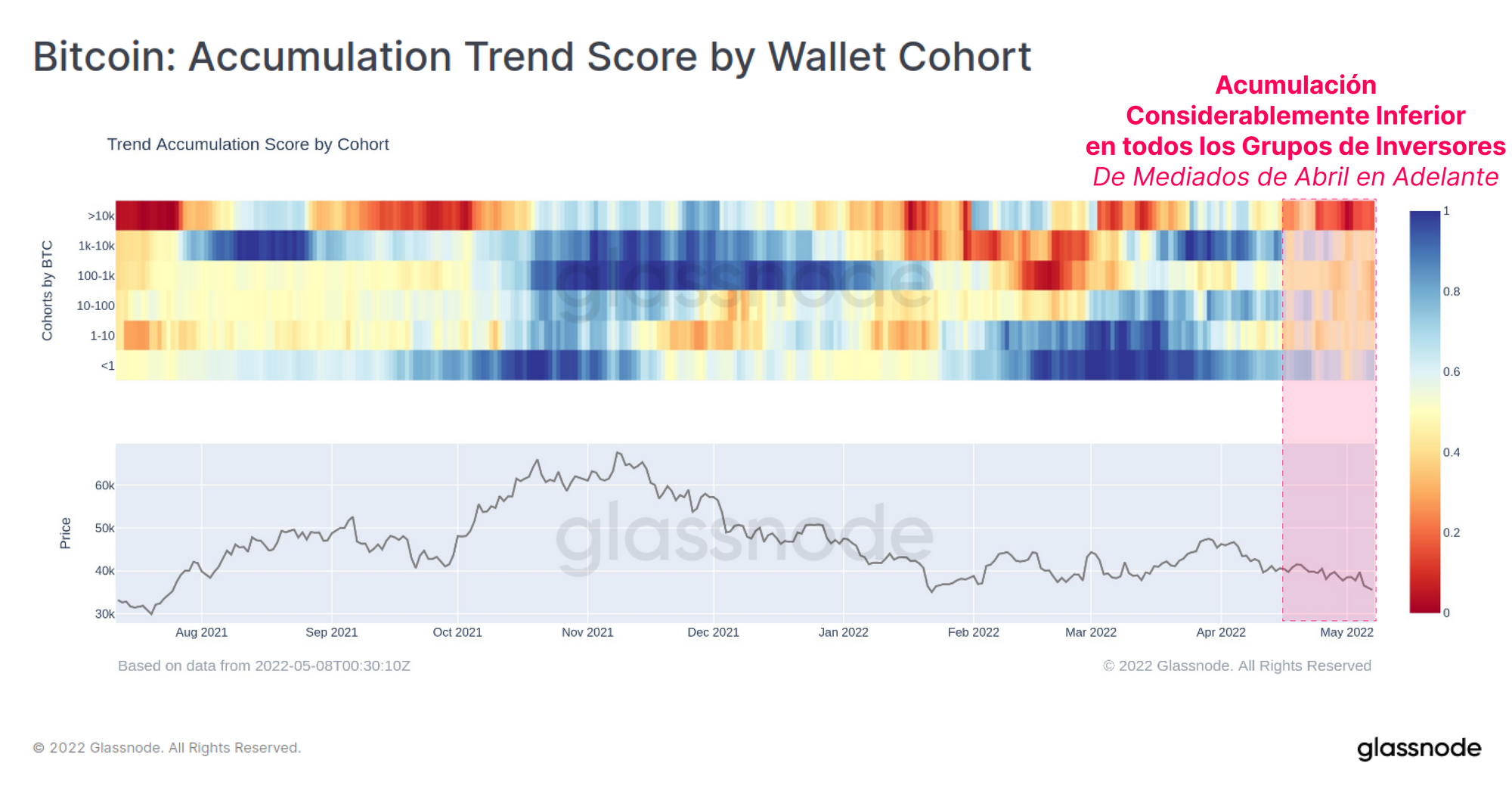 Podemos diseccionarlo aún más separando grupos por carteras, y encontramos que a lo largo y ancho, la mayoría de carteras desde camarones a ballenas, han ralentizado en gran medida sus tendencias de acumulación. Las entidades de mayor calibre con balances de >10.000 BTC han sido la fuerza distributiva más significativa de las últimas semanas, como puede observarse por los grandes valores rojos impresos en la métrica. Los pequeños inversores (<1BTC) son los acumuladores más persistentes, aunque su nivel de acumulación es notablemente inferior al que hubo durante los meses de febrero y marzo.