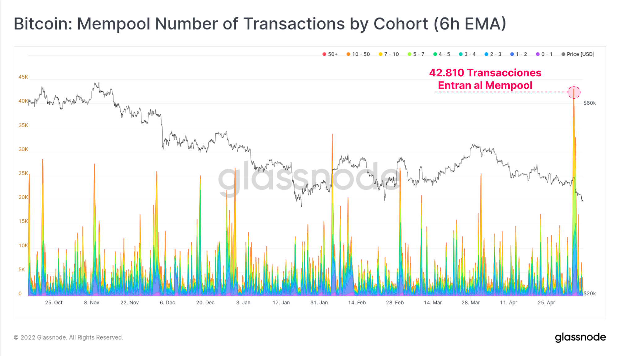 En tiempos de volatilidad y tensión en los mercados, es muy típico ver un gran flujo entrante de transacciones ‘urgentes’ llegar al mempool de Bitcoin, y se debe a las intenciones que tienen los inversores de acotar riesgo, vender, o re-colateralizar el margen en sus posiciones. A la par que el mercado se desplomaba esta semana, hemos visto una explosión de 42.800 transacciones llegar al mempool. Se trata del mayor flujo de actividad de transacciones desde mediados de octubre del 2021, (desde que se comenzó a monitorizar la actividad del mempool).