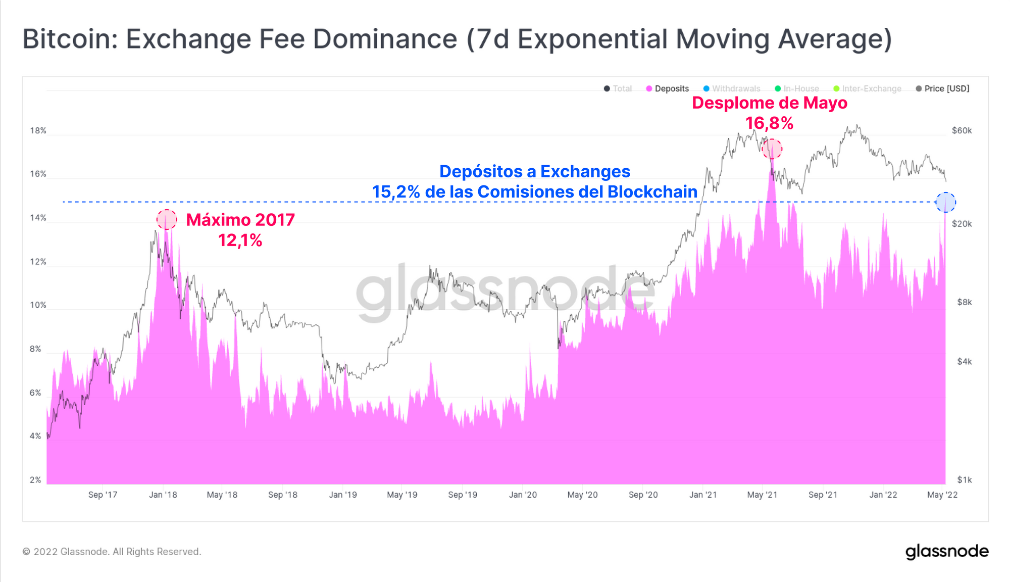 El 15,2% de todas las comisiones por transacción que se pagaron están asociadas a transacciones de depósito en los exchanges, y supera en valor al punto más alto de la carrera alcista del 2017 (12,1%), únicamente superado por el desplome de mayo del 2021 (16,8%).