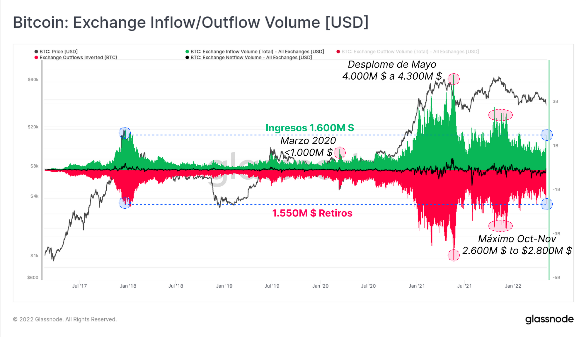 En un día cualquiera, grades volúmenes de BTC fluyen tanto hacia, como desde los exchanges. Las transacciones de los exchanges de más de 750M $ (en ambas direcciones, 1.500M $ en total) han sido valores mínimos muy comunes durante el ciclo de mercado del 2021-22.