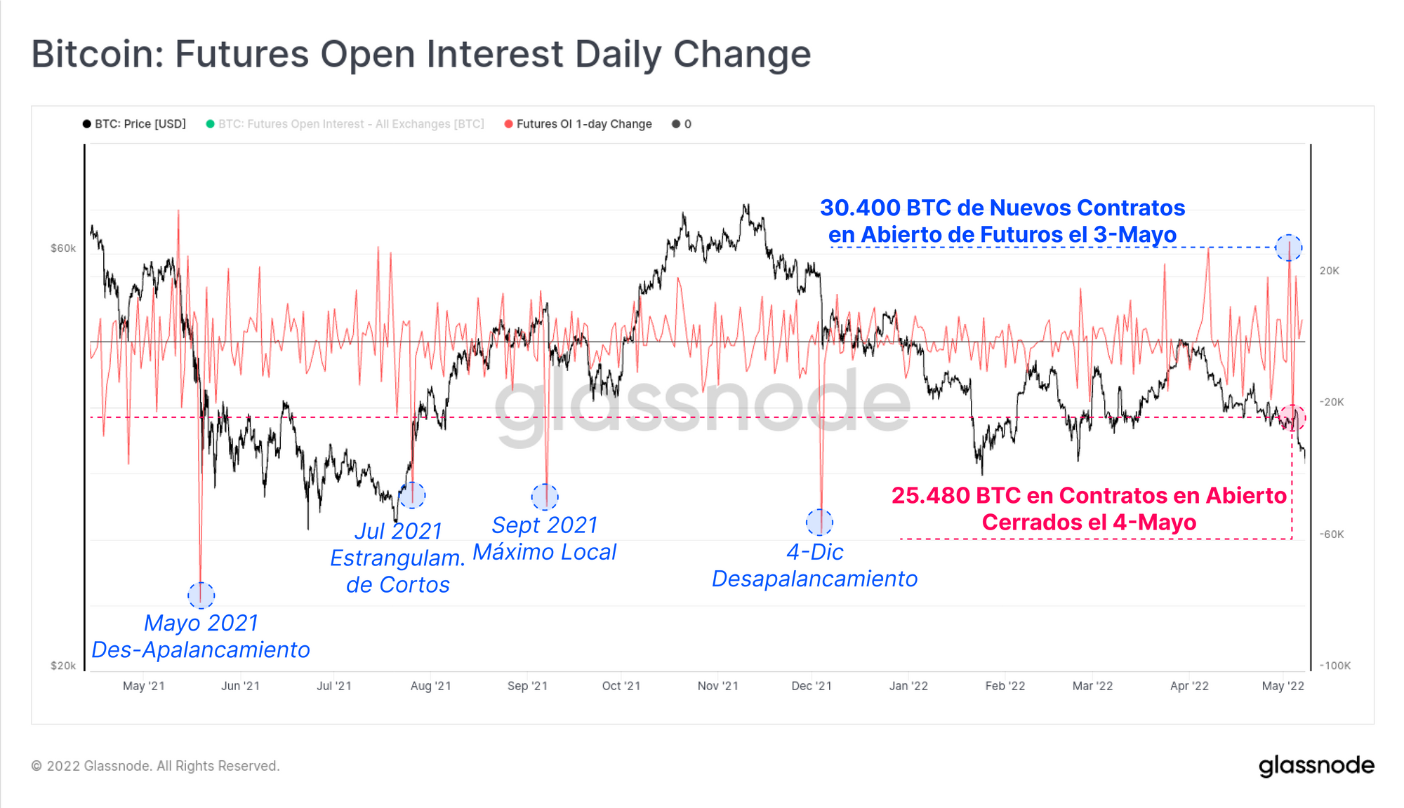 Se puede apreciar la acción de doble efecto que culmina con las declaraciones de la Reserva Federal en el cambio diario de los contratos en abierto de los futuros. Los contratos en abierto crecieron en un total de 30.400 BTC el 3 de mayo, sólo para que 25.800 BTC de los cuales se cerrasen al día siguiente.