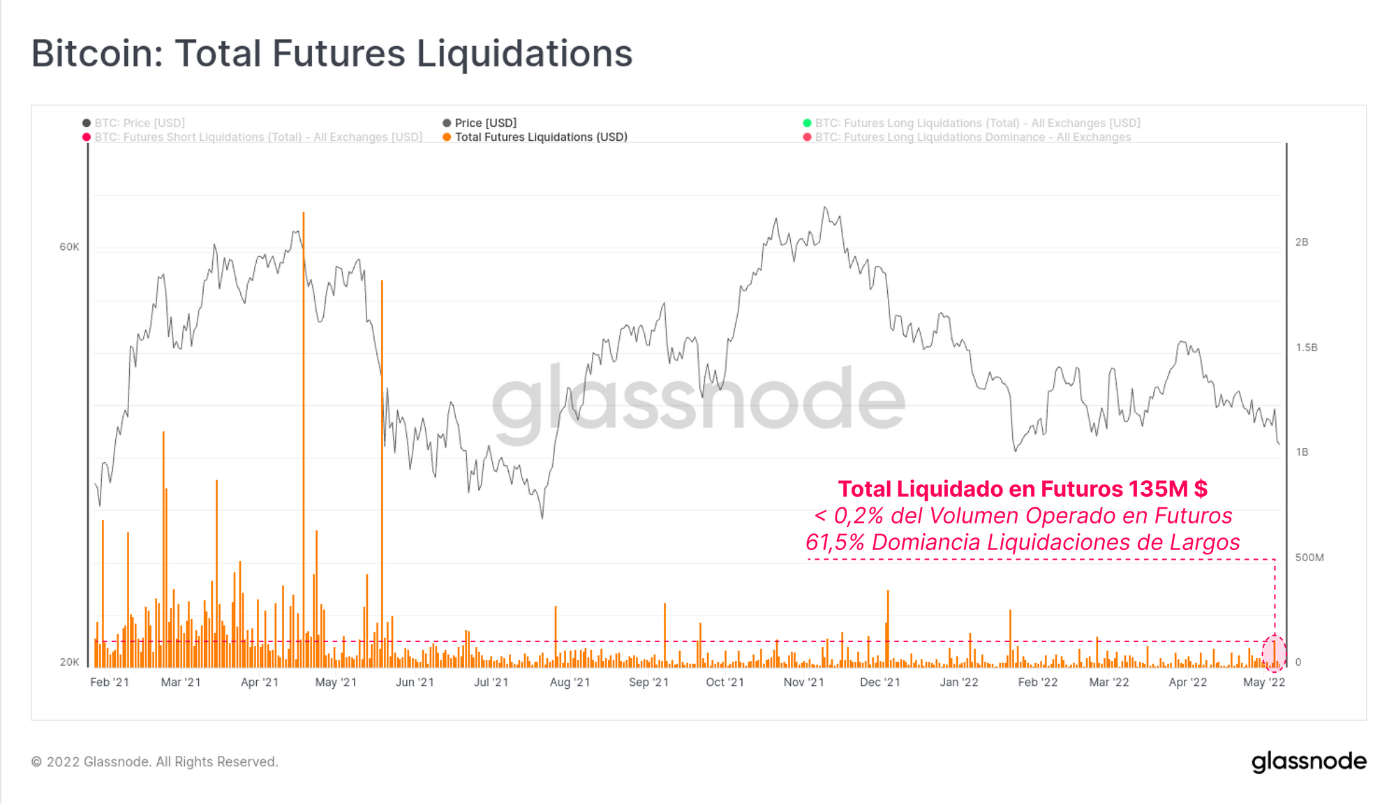 Este argumento gana fuerza cuando nos fijamos en las liquidaciones totales que han tenido lugar en los mercados de futuros. En términos generales, durante un evento de desapalancamiento en el mercado de futuros, esperamos que haya un gran volumen de posiciones forzadas a cerrarse mediante el sistema de liquidación.