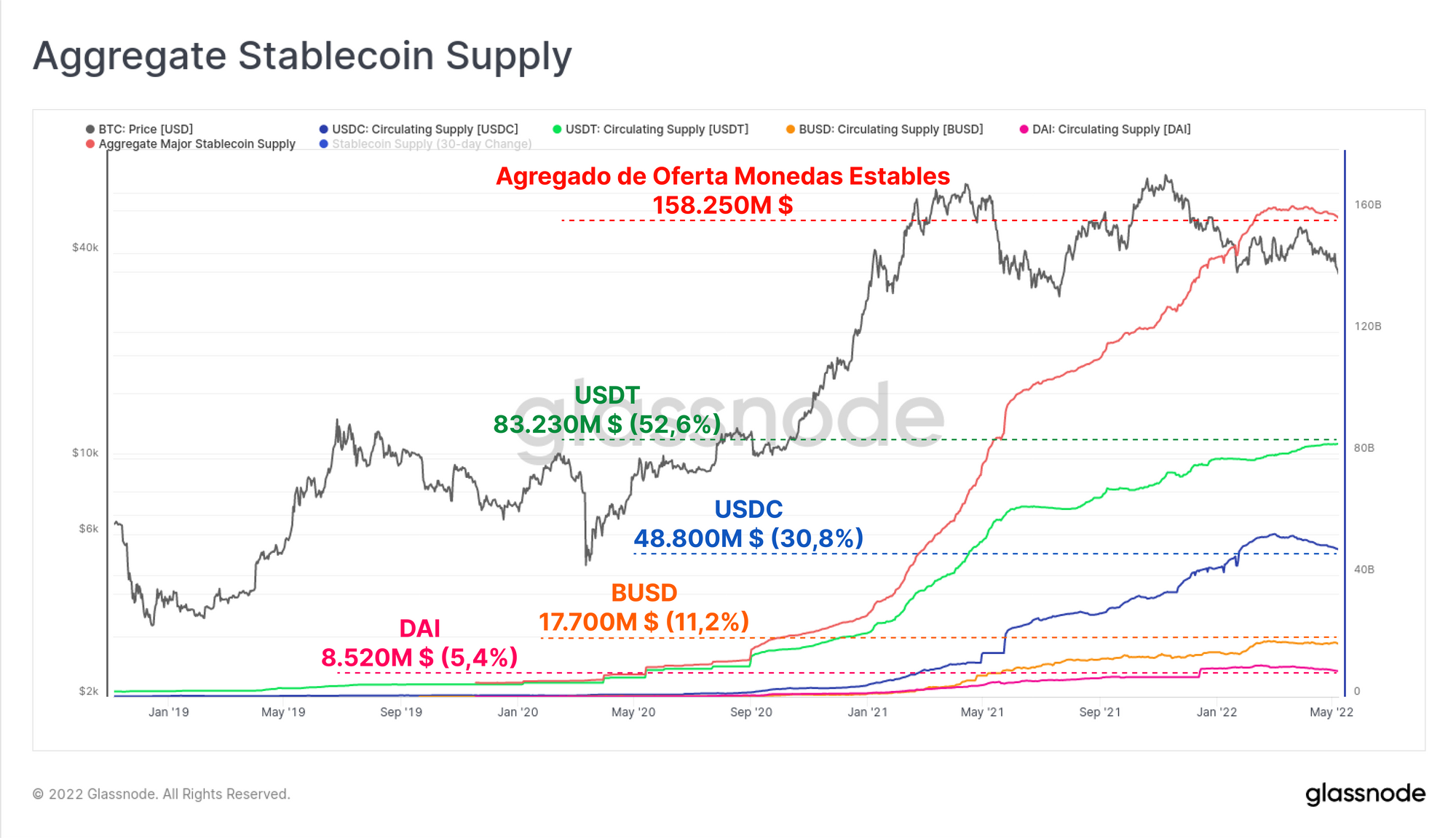 Desde el desplome de marzo del 2020, las ofertas agregadas de las principales monedas estables (USDT, USDC, BUSD y DAI) han aumentado de los 5.330M $, a más de 158.250M $. Significa un espectacular crecimiento de nada menos que el 2.866% en apenas algo más de dos años. USDT sigue siendo el activo predominante, acaparando el 52,6% de las principales ofertas, seguido de USDC con una dominancia del 30,8%.