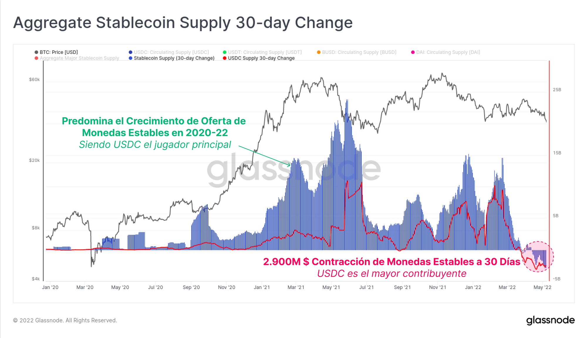Se puede apreciar que desde el mes de mayo del 2021 particularmente, USDC ha sido un participante clave en el crecimiento de la oferta de monedas estables. Y también que la reciente contracción en la oferta de monedas estables es algo realmente raro de ver, especialmente ya que esta reducción de oferta está alcanzando velocidades de -2.900M $ al mes. USDC es el principal activo estandarizado que sufre este canje, poniendo en evidencia que una gran cantidad neta de capital está abandonando en masa la industria de las cryptodivisas.