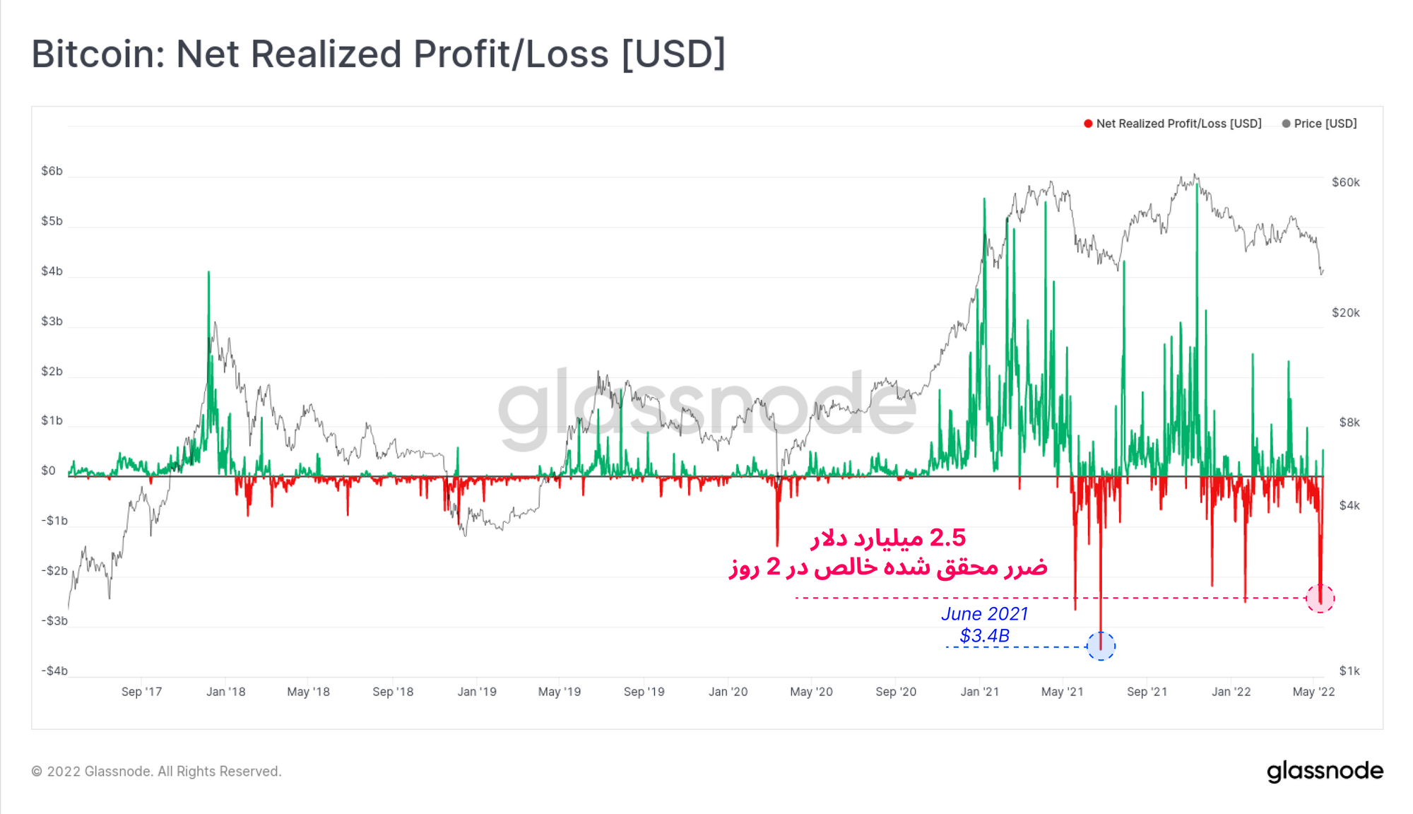 زمانی که ماجرای LUNA آغاز شد، بیتکوین هایی که توسط LFG خریداری شده بود، در قیمت بسیار پایین تر فروخته شدند. USDT نیز با از دستدادن ثبات خود، سبب شد قیمت بیتکوین، ناحیه حمایتی ۲۹ هزار دلار را بشکند و به نواحی قیمتی جولای ۲۰۲۱ برسد. این سقوط قیمتی موجب شد تمام افرادی که در چرخه ۲۰۲۱ تا ۲۰۲۲ بیتکوین خریداری کردند، در ضرر قرار بگیرند و شبکه به طور خالص در ضرر باشد.