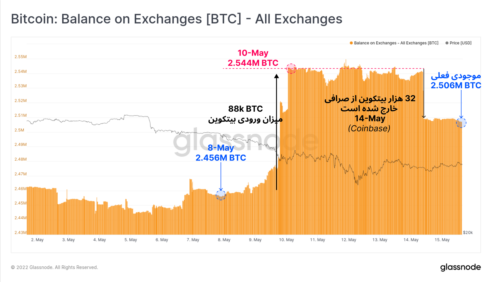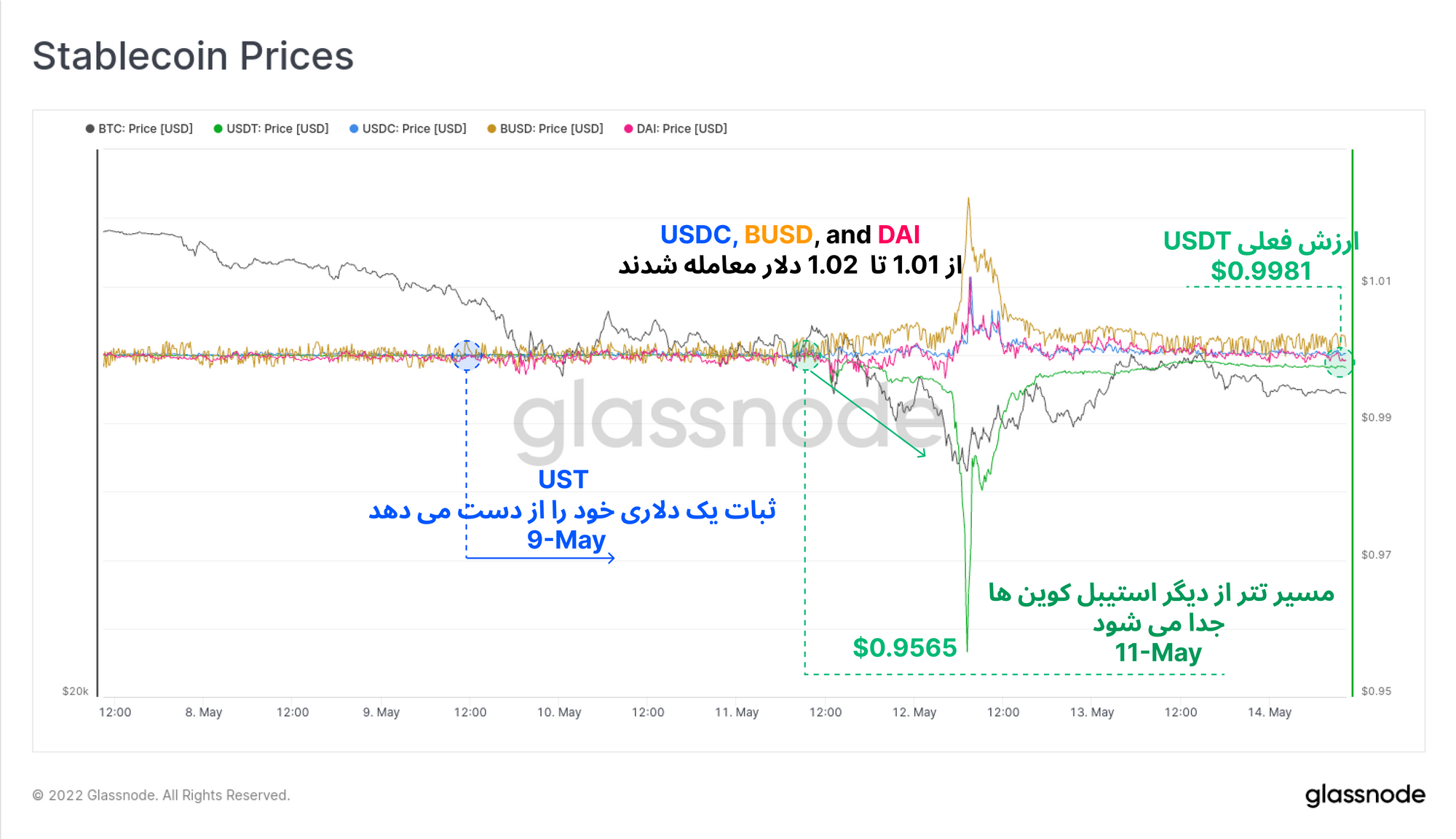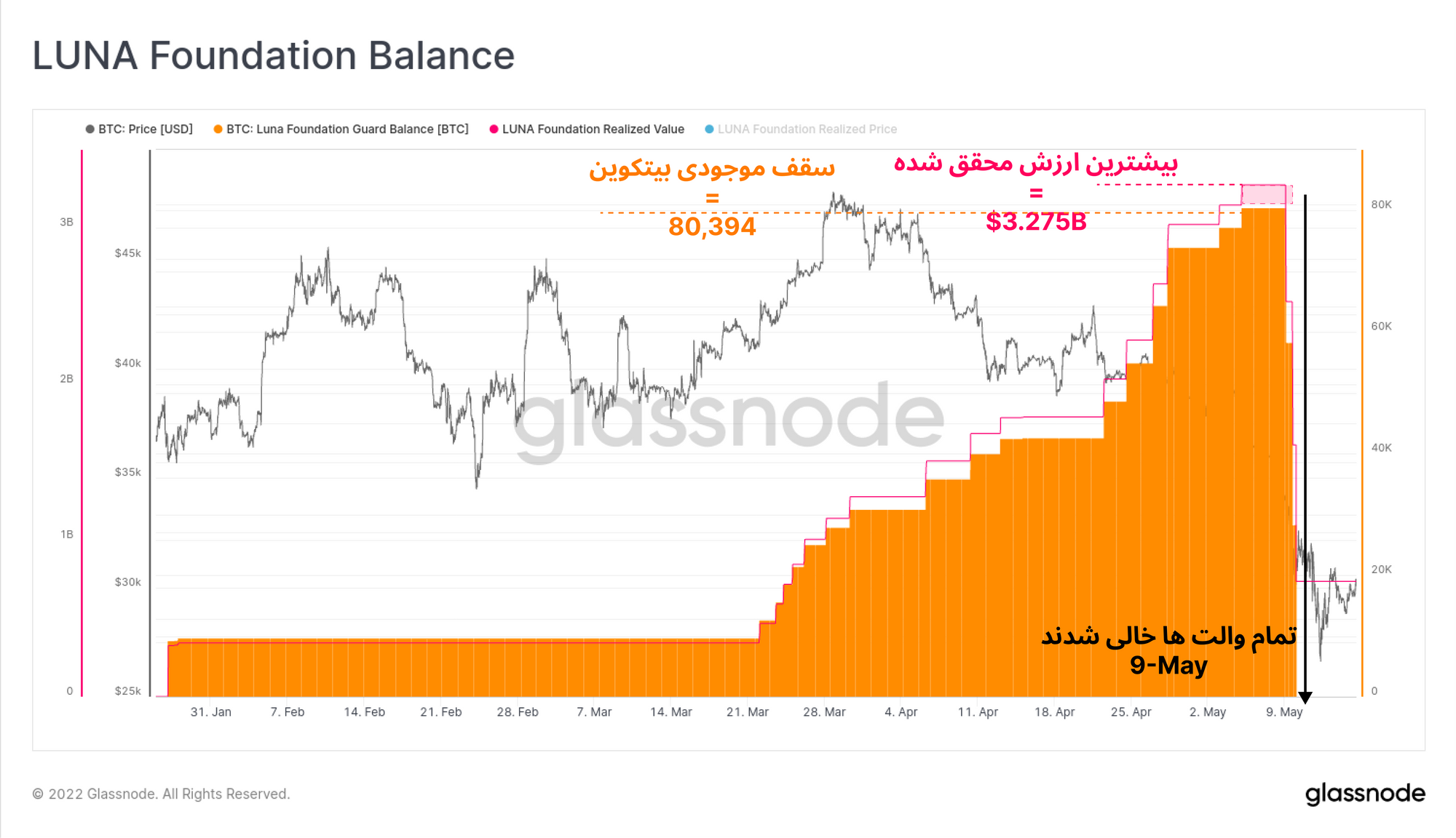 رخدادهای این هفته بیتکوین را باید در کتابهای تاریخی ثبت کرد. در این هفته LUNA/UST به تورم شدیدی دچار شد و ۴۰ میلیارد دلار از ارزش خود را از دست داد. LFG هشتاد هزار بیتکوین خود را فروخت و به دنبال آن Tether نتوانست ثبات یک دلاری خود را حفظ کند. ۷.۵ میلیارد دلار از موجودی استیبل کوینها کاهش پیدا کرد و قیمت بیتکوین تا نزدیکی Realized price پیش رفت.