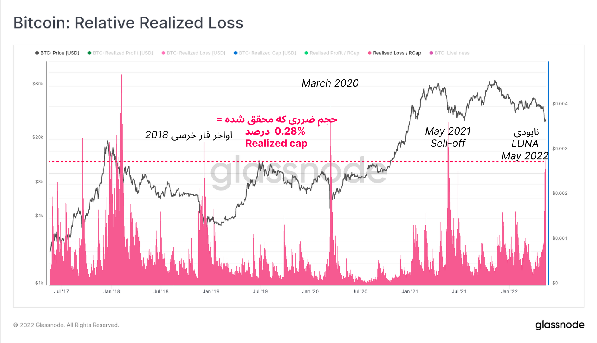 با افزایش کل موجودی بیتکوین، طبیعتا ضررهایی که از فروش بیتکوین محقق می شود بسیار سنگین تر خواهد شد. بنابراین با استفاده از معیار 'relative realized loss'، ضرر محقق شده روزانه کل شبکه را به نسبت Realized cap در نظر میگیریم تا تسلیم بازار را با نمونه فازهای قبلی مقایسه کنیم.