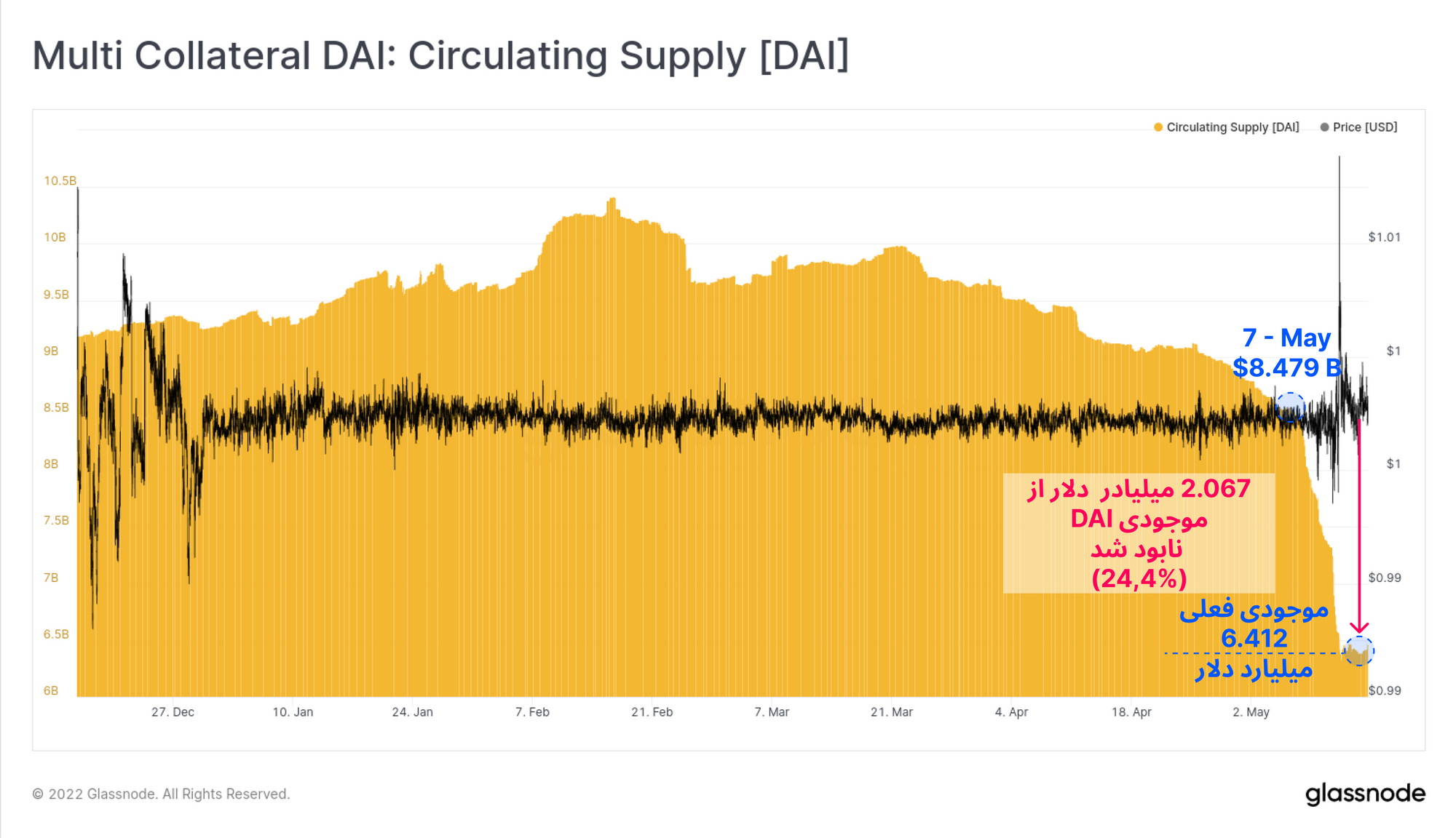 در چند روز اخیر ، ۲.۰۶۷ میلیارد دلار از موجودی استیبل کوین DAI نیز از بین رفت و ۲۴.۴ درصد از موجودی آن کاهش پیدا کرد.