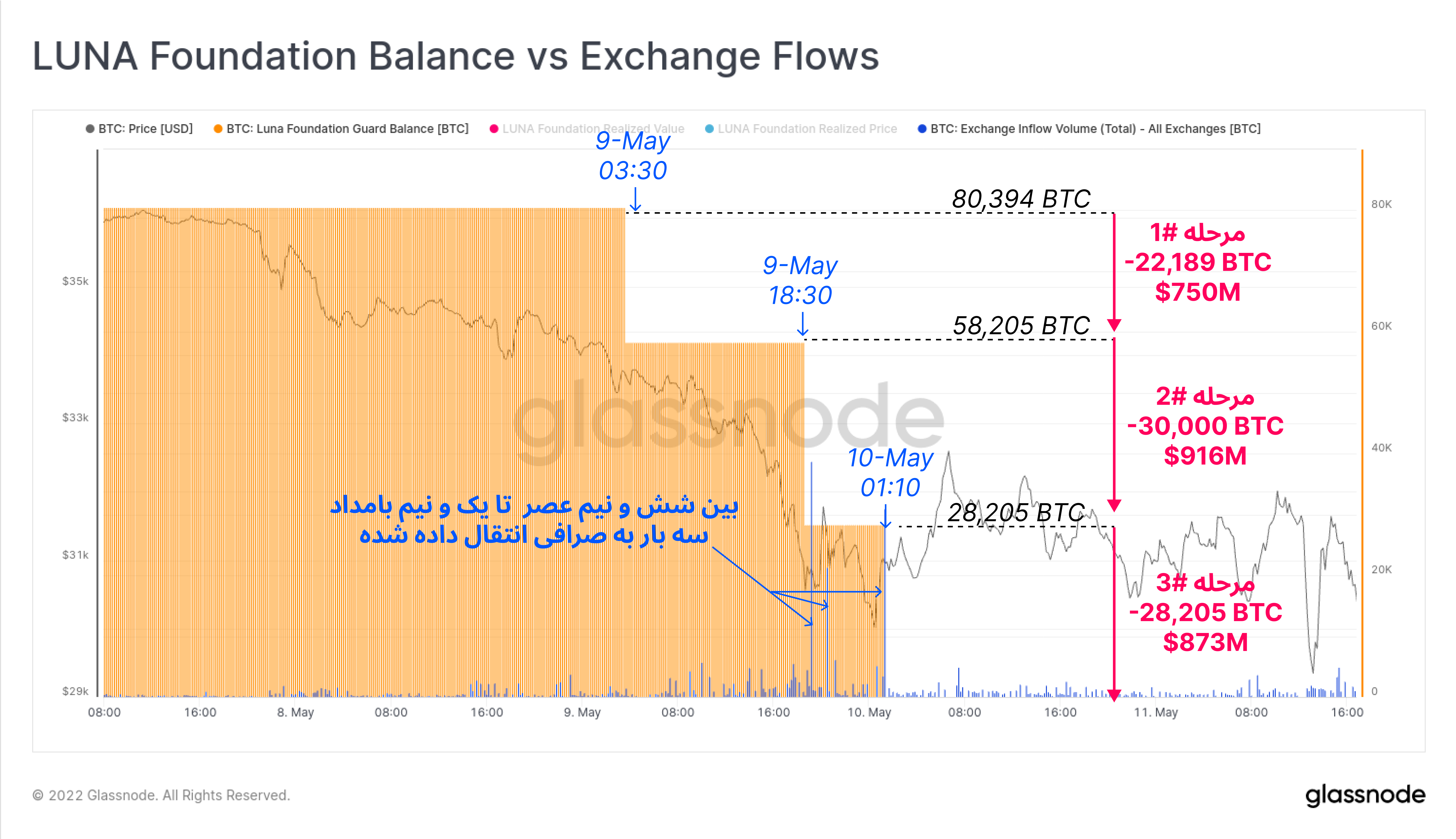 در نمودار زیر مشاهده میکنید که بیتکوین های LFGدر سه مرحله از خزانه خارج شده اند. در مرحله اول زمانی که ارزش UST تا ۰.۹۸ سنت پیش رفت، ۷۵۰ میلیون دلار (۲۲,۱۸۹ بیتکوین) در نهم می، ساعت ۳:۳۰ از خزانه خارج شد. در مرحله دوم، ۱۵ ساعت بعد ،حدود ۳۰ هزار بیتکوین (۹۱۶ میلیون دلار) از خزانه خارج شد و در نهایت، شش ساعت بعد با برداشت ۲۸,۲۰۵ بیتکوین (۸۷۳ میلیون دلار) کیف پول خالی شد.