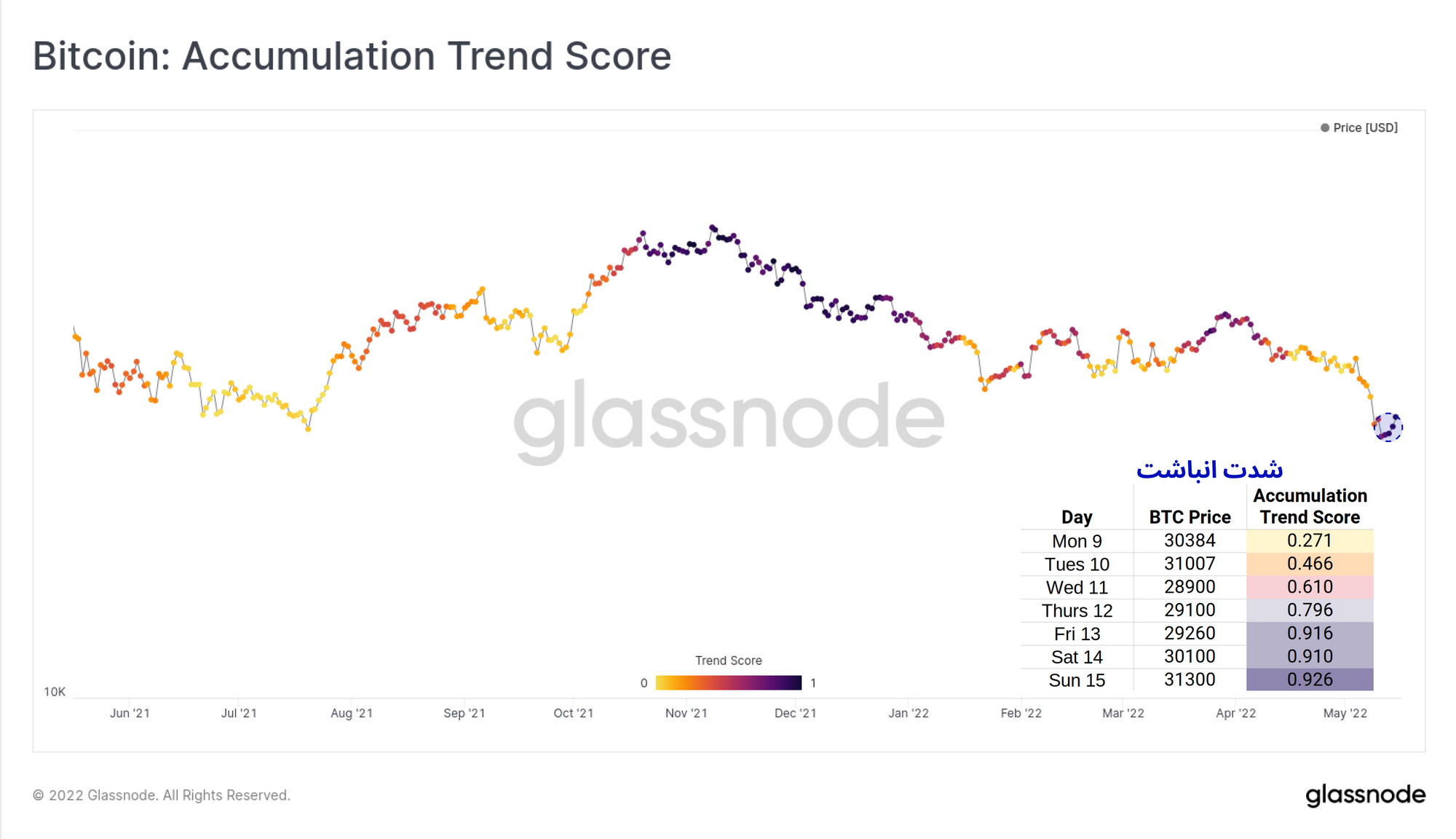 زمانی که بازار در ۱۲ می روز پنجشنبه در پایینترین قیمت قرار داشت؛ شدت روند انباشت از عدد ۰.۳ به ۰.۷۹۶ رسید. در این ناحیه بازار به قیمت، حمایت نشان داد تا بتواند به قیمت ۳۰ هزار دلار برسد. در روزهای بعد، شدت انباشت به میزان ۰.۹ باقی ماند؛ این مقدار به این معناست که در این ناحیه خرید سنگینی انجام شده است.