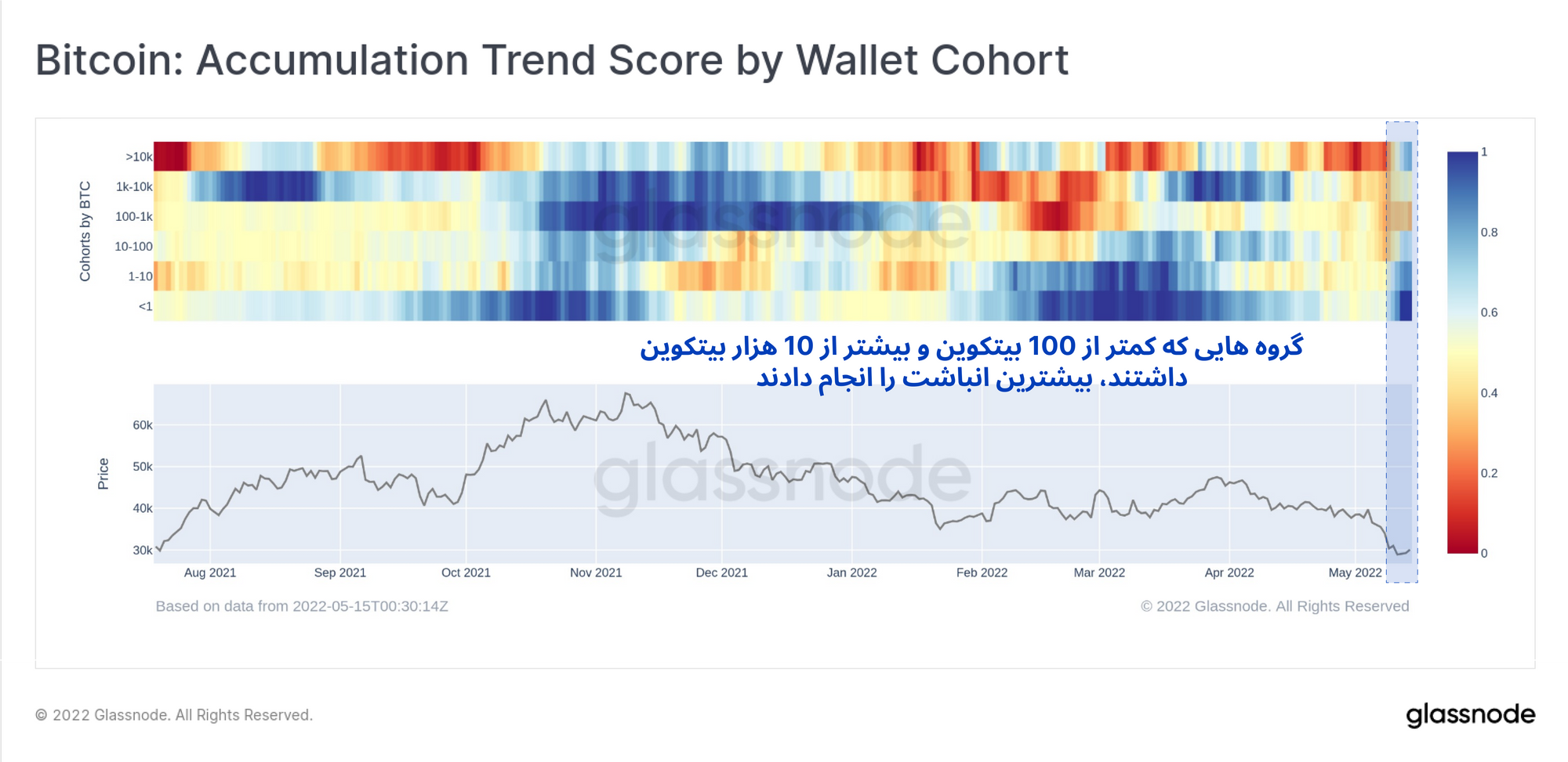 گروهی که کمتر از یک بیتکوین دارند، تا کنون بیشترین مقدار بیتکوین را انباشت کردند. همچنین گروهی که مالک ۱۰ هزار بیتکوین هستند انباشت بسیاری داشتند (البته این گروه شامل LFG نیز میشود که حجم بسیاری به بازار عرضه کرد). کیف پولهایی که بین ۱۰۰ تا ۱۰ هزار بیتکوین داشتند، همچنان انباشتی ندارند.