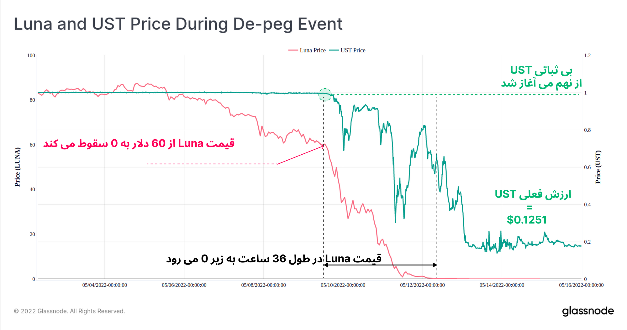 در نهم می، ثبات یک دلاری UST از بین رفت و در همان روز قیمت LUNA در حدود ۶۰ دلار قرار داشت (یعنی از بالاترین قیمت خود ۴۹ درصد افت داشت). طی ۳۶ ساعت بعد، قیمت LUNA، به زیر ۰.۱ سنت سقوط کرد و ارزش UST بین کف ۰.۳۰ سنت و سقف ۰.۸۲ سنت حرکت میکرد. این سقوط باعث شد کاربران، وحشتزده UST خود را به معادل LUNA تبدیل کنند و با ایجاد تورم شدید موجودی Luna ،سبب سقوط قیمت آن شوند.
