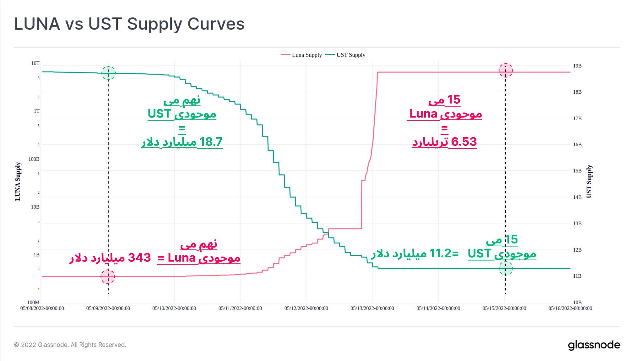 در نمودار زیر شدت تورم موجودی LUNA را مشاهده میکنید. موجودی UST (خط سبز سمت چپ) در مقیاس خطی نشانداده شده که موجودی آن از ۱۸.۷ میلیارد دلار تا ۱۱.۲ میلیارد دلار کاهش پیدا کرد. درحالیکه موجودی LUNA ( قرمز، سمت راست) از ۳۴۵ میلیون دلار به ۶.۵۳ میلیارد دلار افزایش یافت؛ بهعبارتدیگر Luna در یک سال۹۹,۲۶۳,۸۴۰ میلیون درصد تورم را تجربه کرده است.