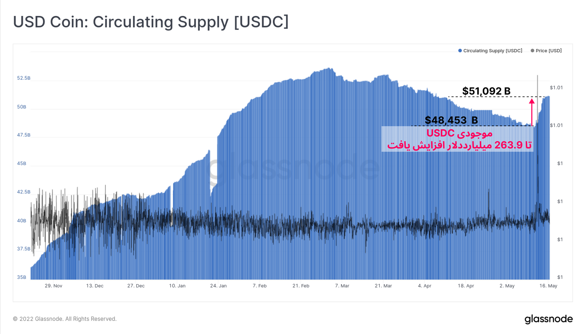 در نمودار زیر می بینیم که موجودی USDC از اواخر فوریه در حال کاهش بوده؛ اما در اوج نگرانی بازار نسبت به استیبل کوین ها، ۲.۶۳۹ میلیارد دلار به موجودی USDC اضافه شده که نشان می دهد سرمایه گذاران در اوضاع تشویش بازار،این استیبل کوین را به انواع دیگر ترجیح دادند.