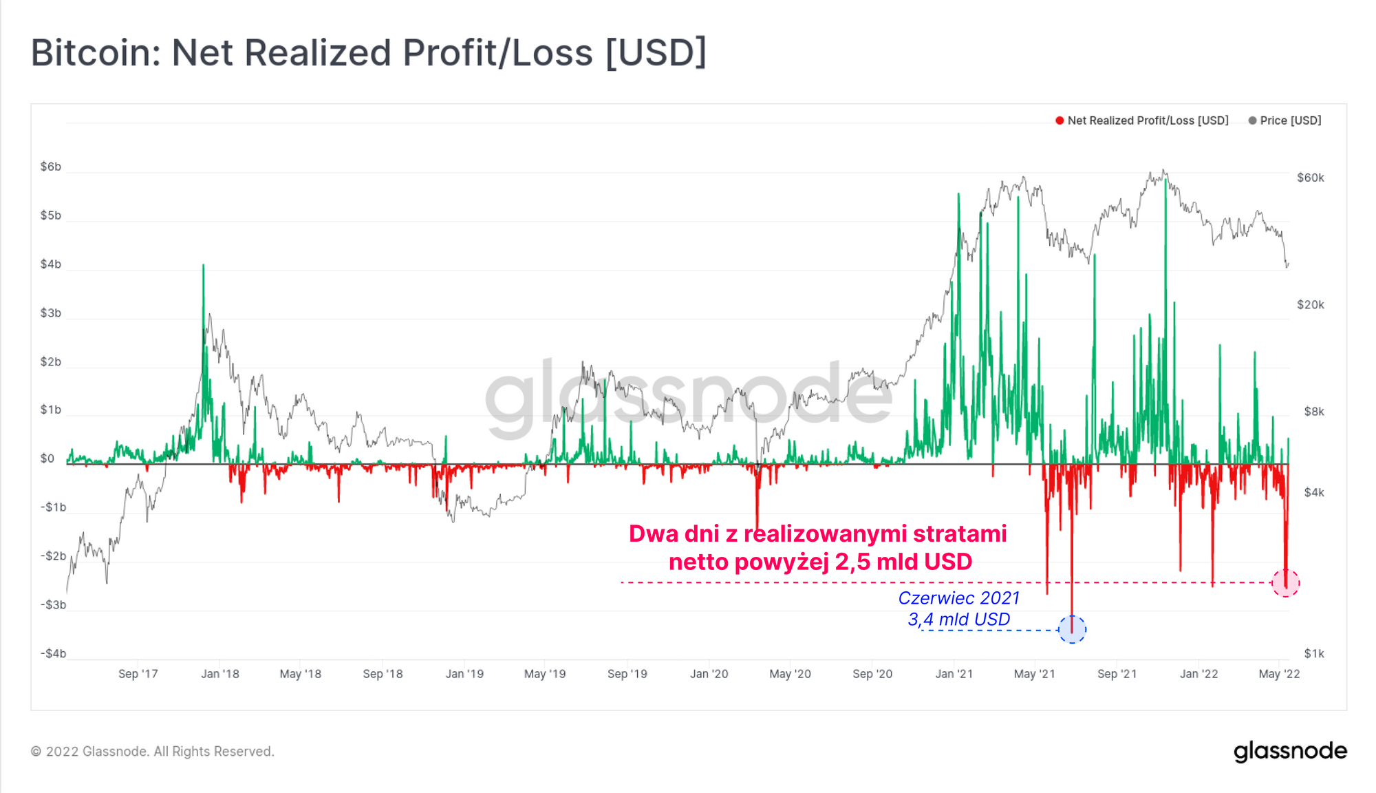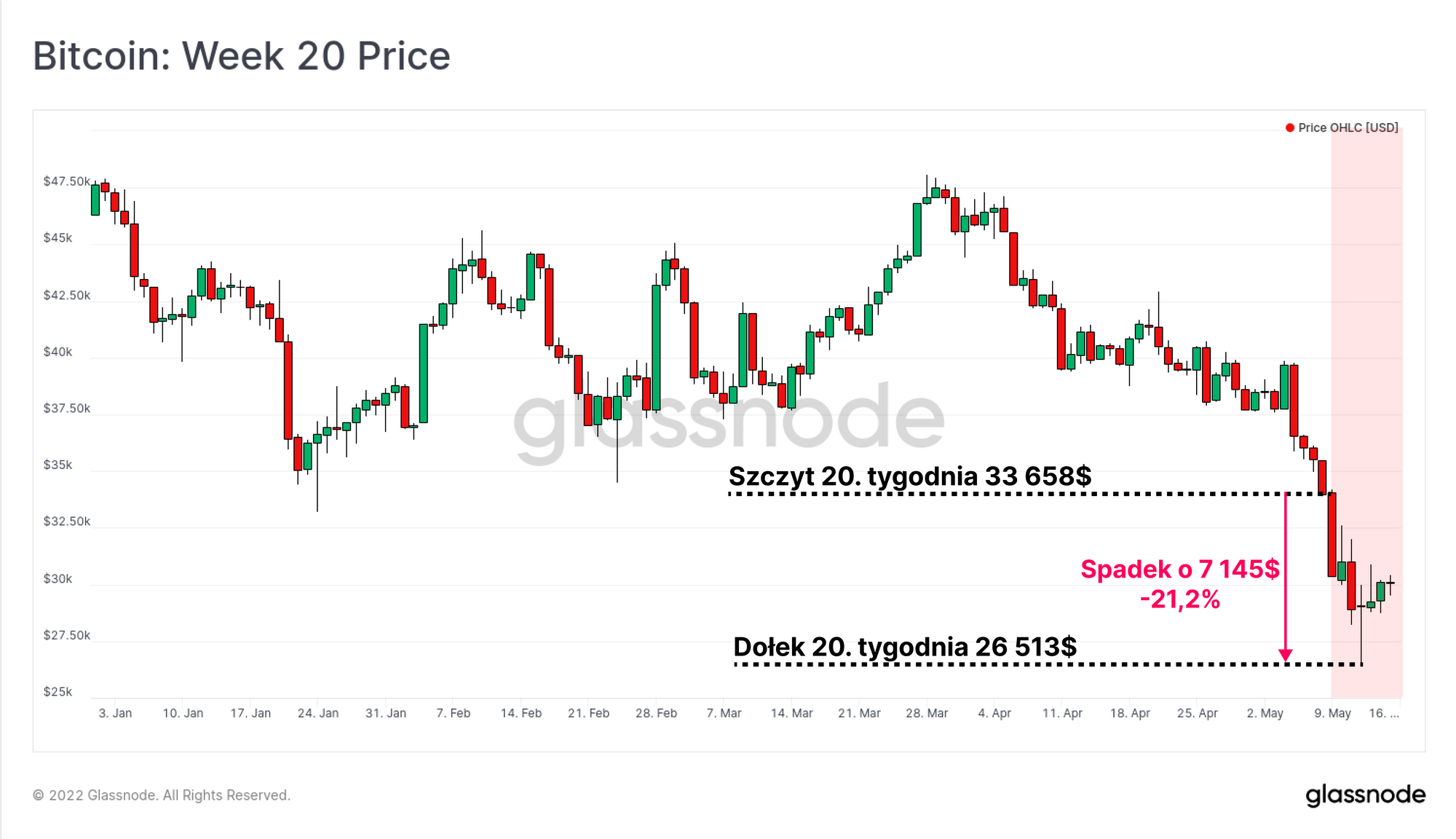 W wyniku problemów stablecoinów i pod wpływem „ciężaru” Bitcoinów o wartości 3,275 miliardów dolarów sprzedanych przez LFG, cena Bitcoina spadła o 21,2% do poziomu 26 513$. Jest to najniższa cena od grudnia 2020 roku, która naturalnie stawia znaczną część rynku w obliczu presji finansowej.