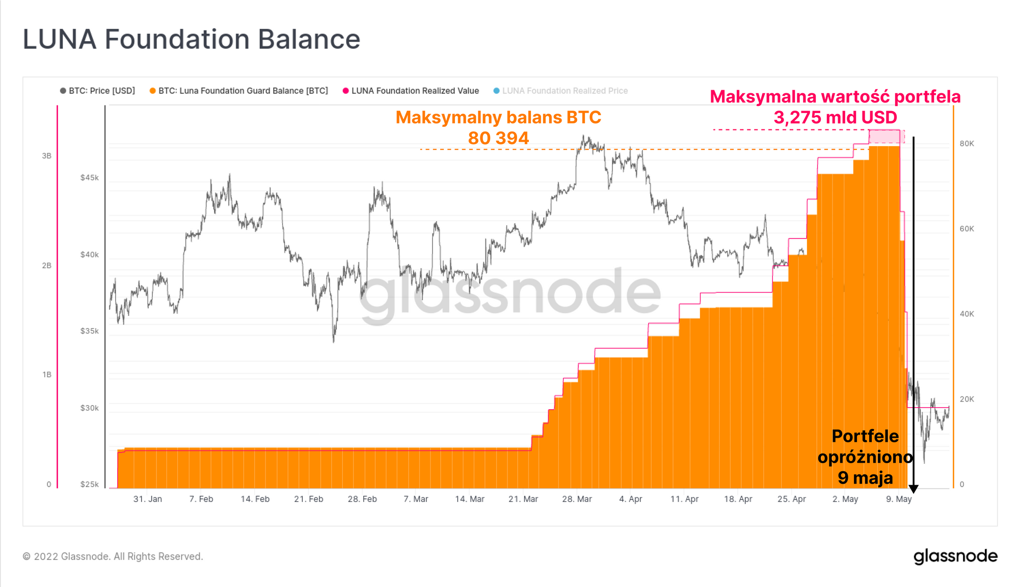 Wraz z rozwojem sagi LUNY, coiny zakupione przez LFG były przesyłane po sieci po cenach znacznie niższych, niż po których zostałe zakupione. Wraz z presją na kurs UST, ceny przełamały ustanowiony w lipcu 2021 roku opór cenowy na poziomie 29 tys. dolarów. W rzeczywistości zepchnęło to wszystkich inwestorów z cyklu 2021-22 pod kreskę i przyspieszyło realizację strat.