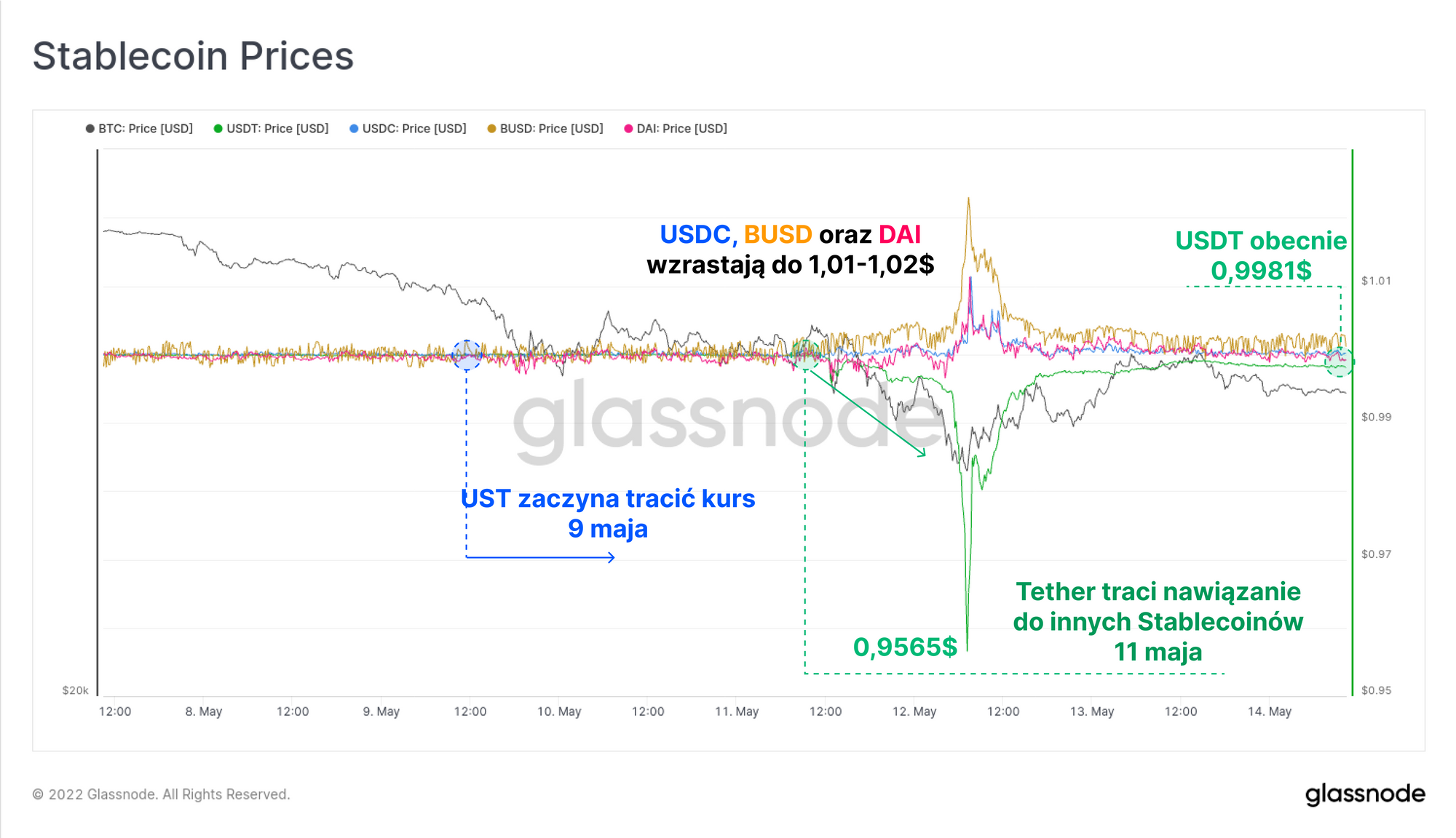 W dalszej części tygodnia, wraz z nasilaniem się informacji dotyczących utraty kursu UST, rynek przejściowo wyraził obawy co do zabezpieczenia kursu Tethera (USDT). Jego kurs spadł chwilowo do poziomu 0,9565$, jednak wrócił on do pierwotnych poziomów w ciągu 24h, będąc obecnie notowanym z małą różnicą, na poziomie 0,998$.