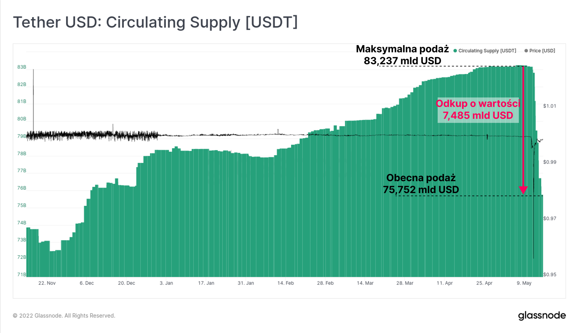 Jeśli zerkniemy na podaż USDT, zauważymy, iż w rzeczywistości w ciągu tygodnia odkupiono USDT o wartości 7,485 miliardów dolarów. Całkowita podaż USDT zmalała z okolic rekordu, tj. 81,237 miliardów USD do 75,75 miliardów USD. Jak zauważono w ubiegłotygodniowym raporcie, ostatnie skurczenie się podaży stablecoinów o 2,9 mld USD było największym w swej historii i spowodowane głównie przez USDC. Tak więc skala odpływu kapitału z tego tygodnia stawia go na pole position w tej kategorii.