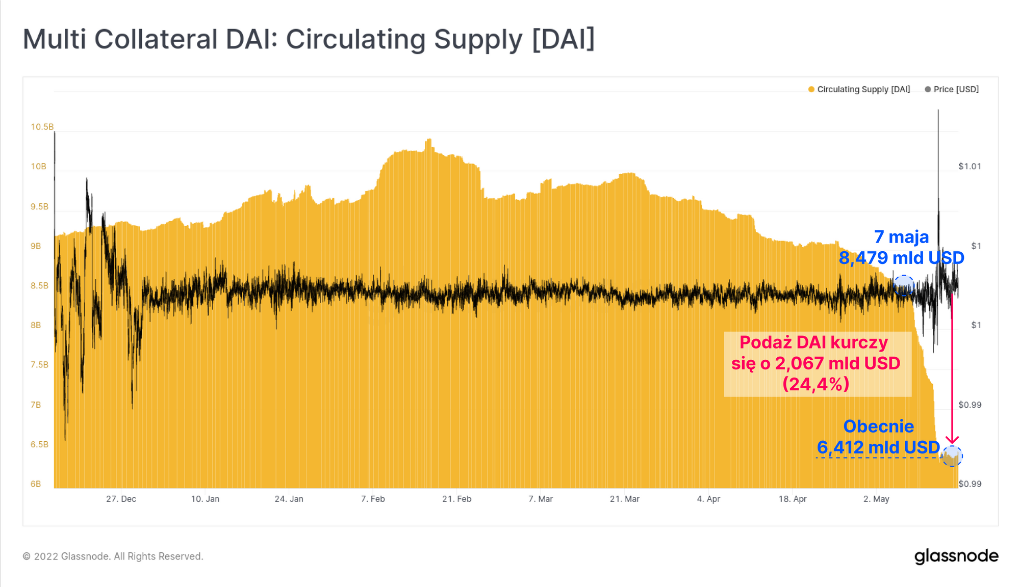 Kolejnym stablecoinem, który doświadczył dramatycznej zmiany podaży jest DAI, w przypadku którego to spadła ona o 24,4%, co związane było ze spaleniem coinów o wartości 2,067 miliardów dolarów. DAI jest stablecoinem zabezpieczonym przez inne kryptowaluty zastawione w protokole Maker. Podaż DAI zmniejszać się będzie, gdy osoby zaciągające kredyt zamykają swoje pozycje poprzez spłatę i w konsekwencji spalanie DAI.