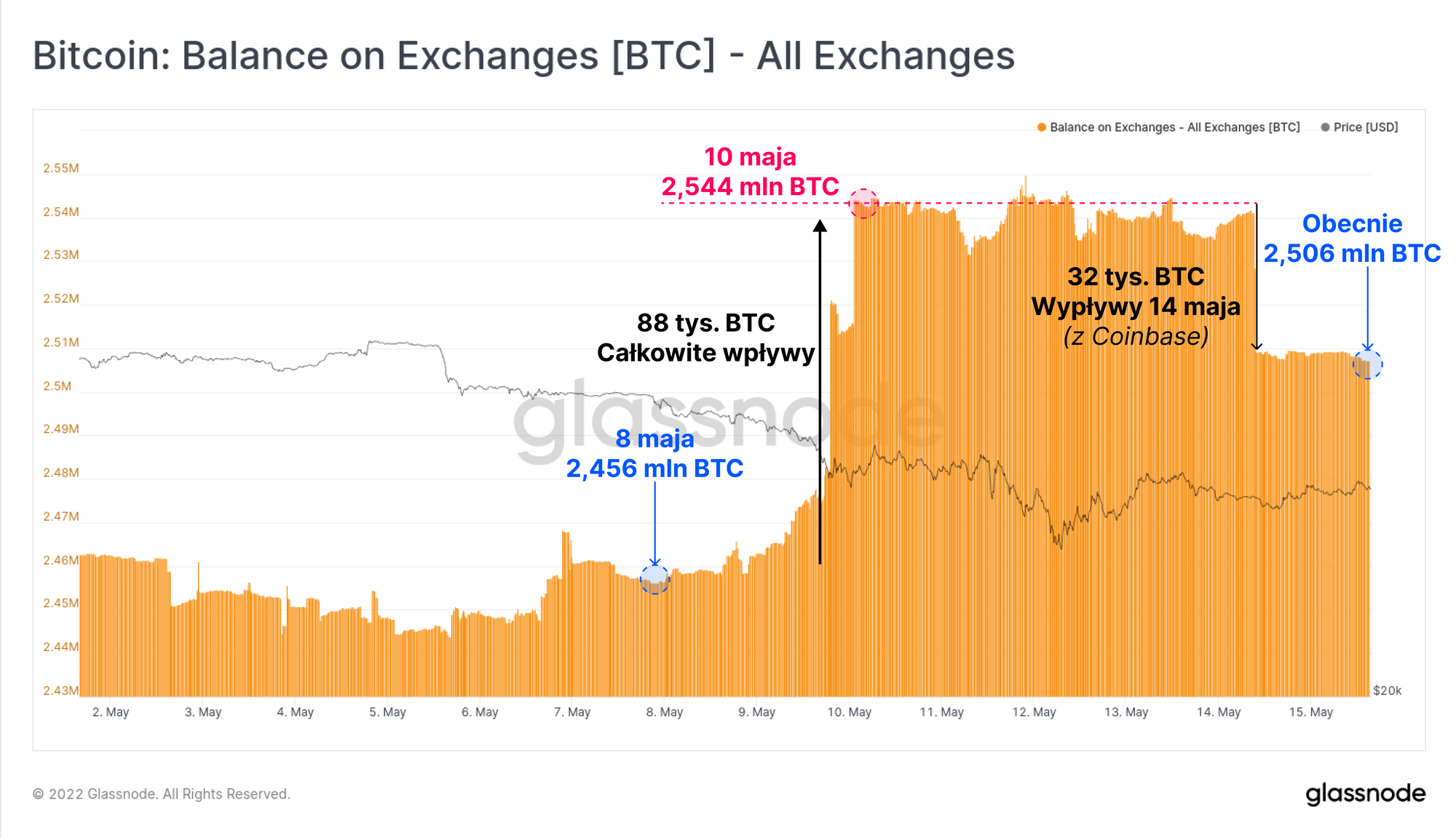 W tym czasie łączne salda giełd wzrosły o 88 tys. BTC, co stanowi więcej niż 80 394 BTC wyprzedanych przez LFG. Sygnalizuje to, iż wydarzenia związane z LUNĄ wywołały panikę, a inwestorzy Bitcoina przyczynili się presji sprzedażowej. Duży wypływ zanotowano z giełdy Coinbase 14 maja, chociaż nie wydaje się, aby giełda ta stanowiła odbiorcę coinów pochodzących z LFG.