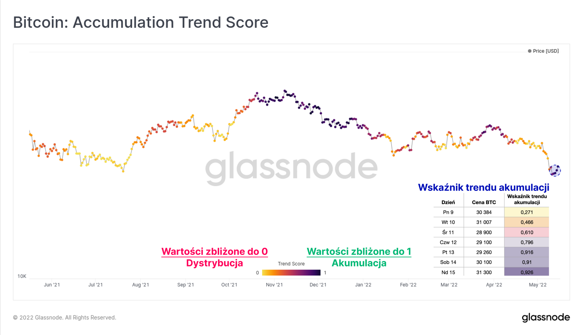 W czwartek 12 maja, gdy rynek znajdował się w dołku, Wskaźnik trendu akumulacji zmienił swoje wskazania z bardzo słabej wartości poniżej 0,3 do wartości 0,796. Wspierając odbicie ceny z powrotem w okolice 30 tys. dolarów, Wskaźnik trendu akumulacji wskazywał wartości powyżej 0,9 przez pozostałą część tygodnia, co sugeruje silną aktywność po stronie kupujących.