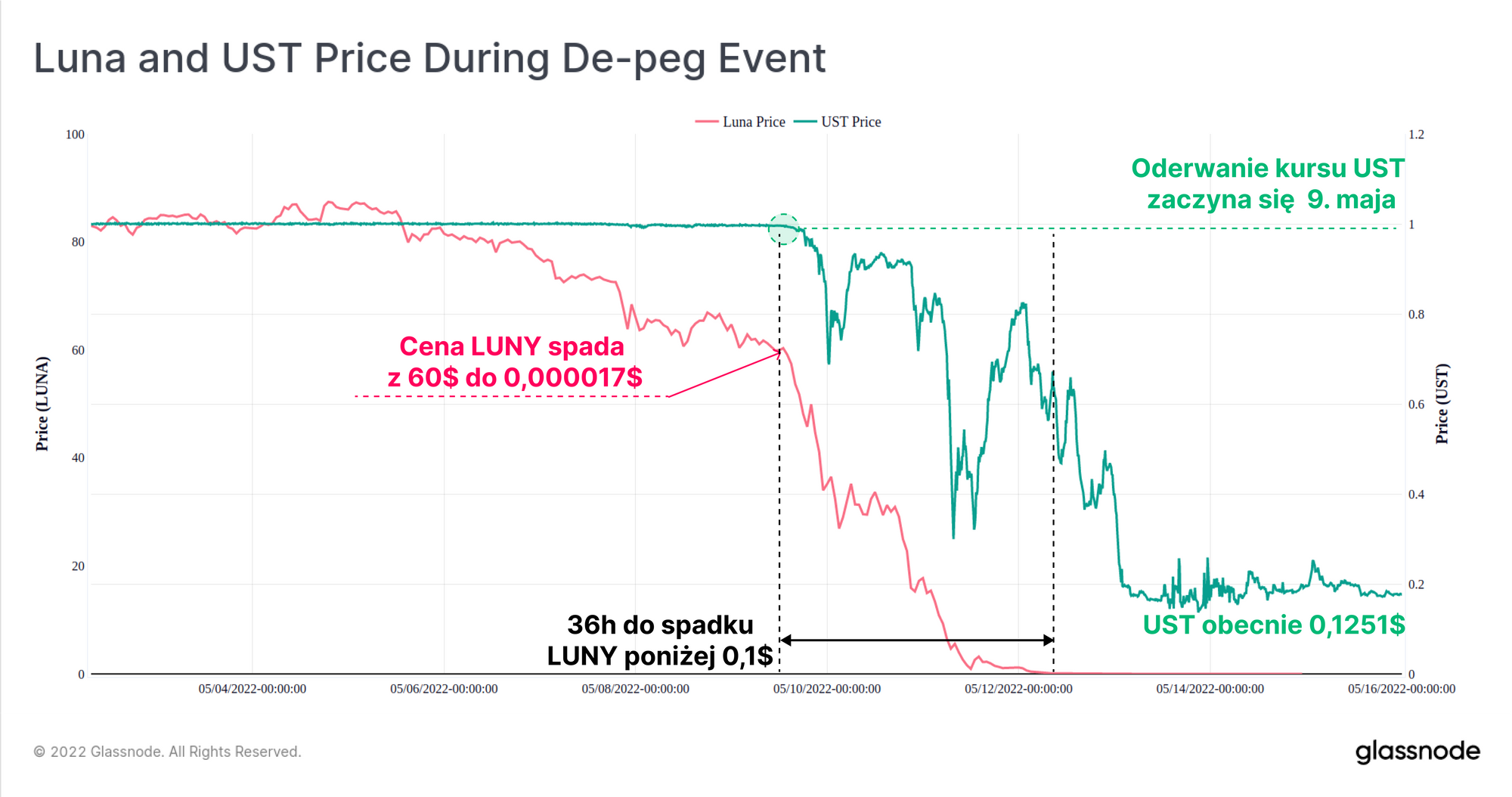 Kurs UST zaczął się wyłamywać 9 maja, gdy cena LUNY znajdowała się w okolicach 60$ (~49,5% poniżej rekordu notowań wynoszącego 119$). W ciągu następnych 36 godzin cena LUNY spadła poniżej 0,1$, a kurs UST wahał się między skrajnymi wartościami 0,30$ i 0,82$. Spowodowało to przeciążenie wbudowanego w protokół mechanizmu wykupu, ponieważ użytkownicy zarówno panikowali, a także dokonywali arbitrażu 1 UST na LUNĘ o wartości 1$, dalej nadmuchując podaż i spychając cenę coraz niżej.