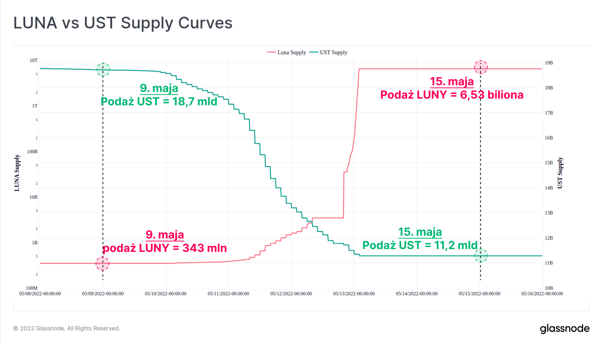 Skalę inflacji podaży LUNY zobaczyć można na wykresie poniżej, na którym ilość UST (zielona linia, oś z prawej strony) zaprezentowana jest w skali liniowej, podczas gdy LUNA (linia czerwona, oś z lewej strony) przedstawiona jest w skali logarytmicznej. W przeciągu jednego tygodnia wykupiono 7,5 miliarda UST (40% podaży), podczas gdy podaż LUNY poszybowała z 343 milionów do ponad 6,53 bilionów coinów, co w przeliczeniu daje nam roczną stopę inflacji LUNY równą 99 263 840%.