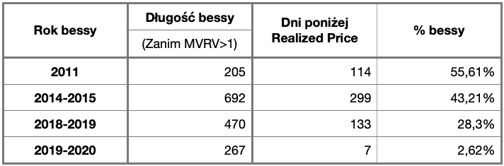Historycznie, poziom Realized Price zapewniał nam silne wsparcie podczas bessy oraz dawał sygnał o możliwym formowaniu się dołka, gdy notowania znajdowały się poniżej tego poziomu. Tabelka poniżej przedstawia poprzednie bessy w poszczególnych cyklach oraz ilość dni, gdy notowania znajdowały się poniżej poziomu Realized Price.
