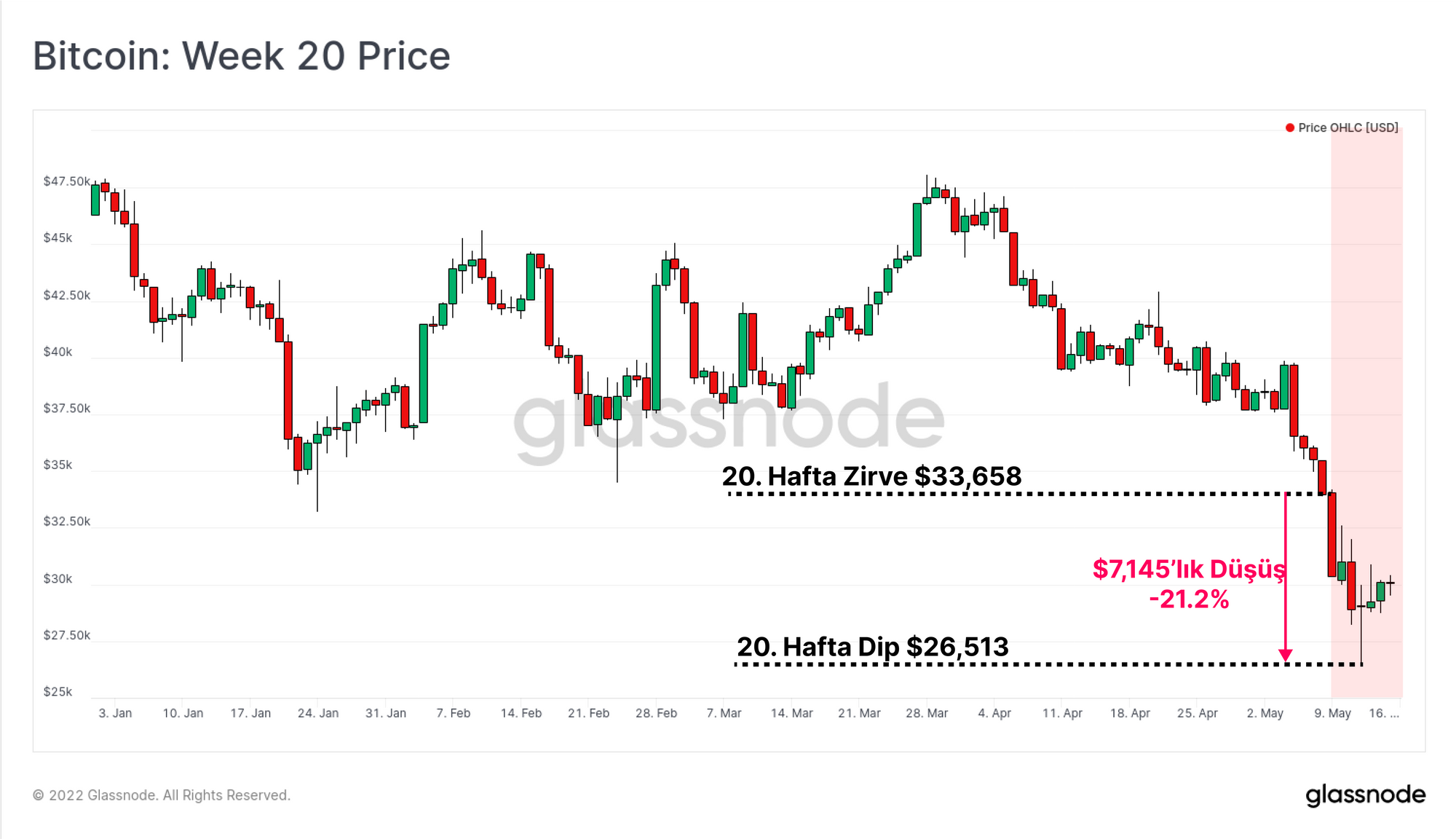 Bitcoin piyasası, 40 milyar dolarlık LUNA/UST projesinin aşırı şişip ve sonrasında çöktüğü, LFG tarafından satılan 80 bin BTC, 1 dolarlık Tether sabit değerinin baskılandığı, stabilcoin arzının 7,5 milyar dolarlık daraldığı ve gerçekleşen fiyata yaklaşarak tarihe geçtiği bir hafta yaşadı.