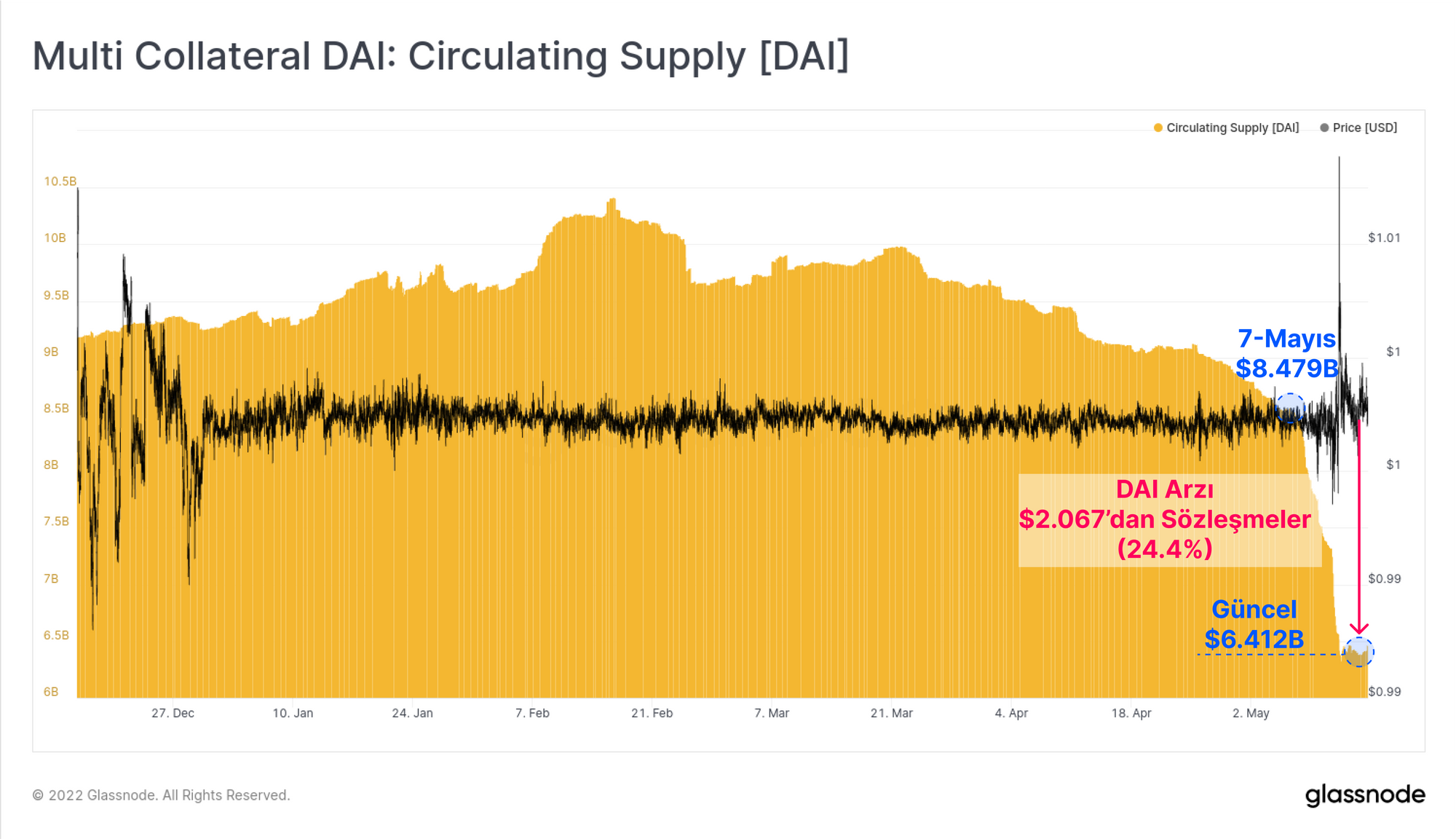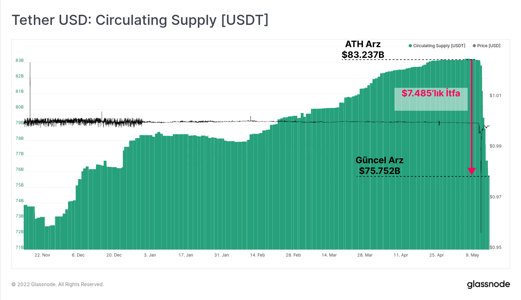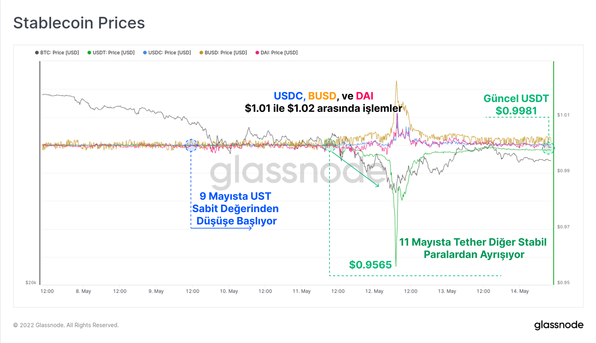 Haftanın ilerleyen günlerinde ve UST'nin sabit değerinin kaybedilmesi haberlerinin ivmesiyle, piyasa geçici olarak Tether'in sabitleyicisinin (USDT) kalitesine ilişkin endişeyi tekrar gündeme getirdi. USDT kısa bir süre için 0.9565$'a düştü, ancak 24 saat içinde toparlandı ve şu anda 0.998$'lık çok küçük bir düşük değer ile işlem görüyor.