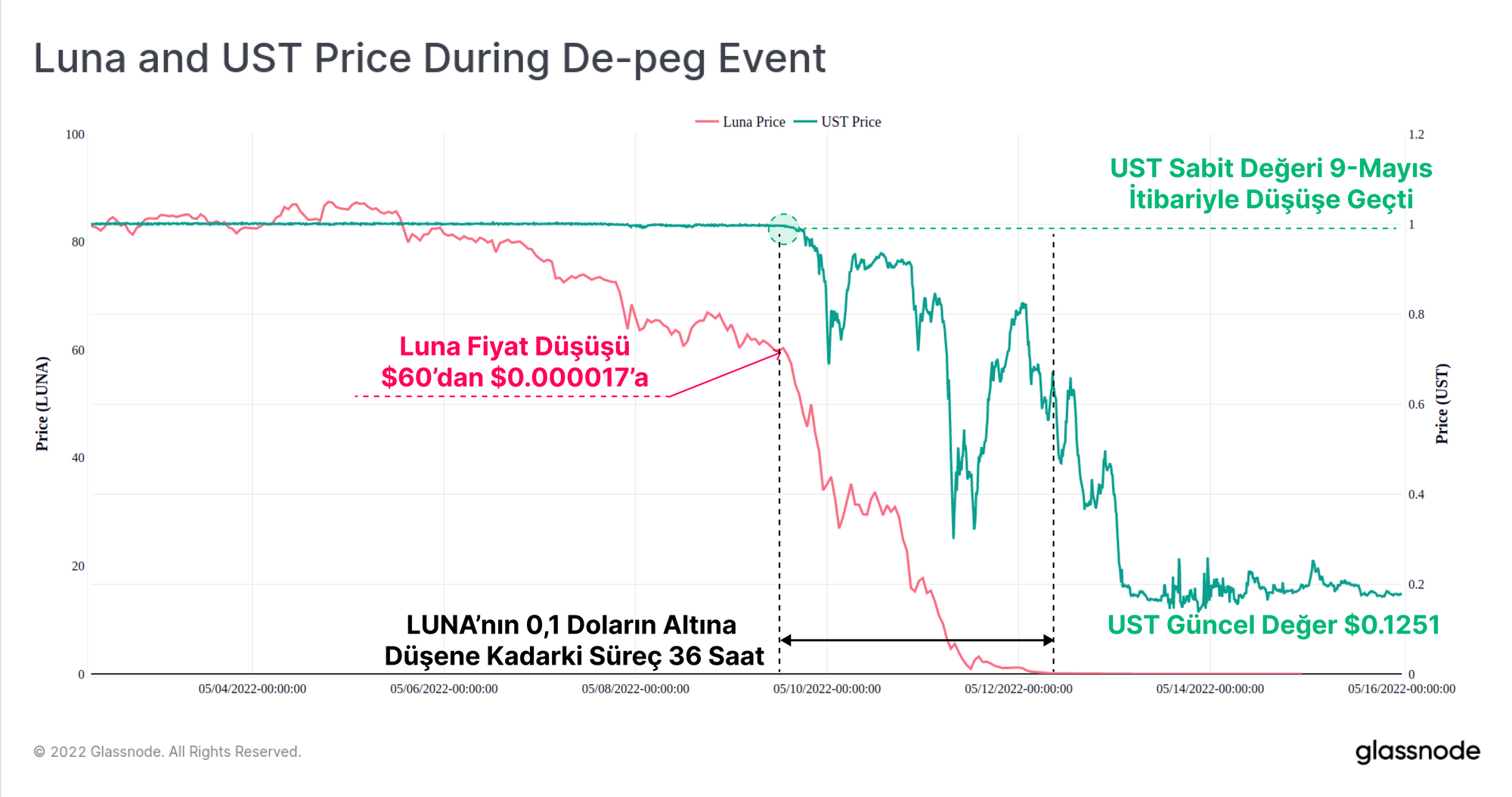 Kripto para piyasaları, UST ve USDT olmak üzere iki stabilcoin için döviz kurunun merkezde olmasıyla bir haftalık tarihi volatilite ve kaos yaşadı. Sadece birkaç gün içinde, piyasa değerine göre en iyi 10 dijital varlık (LUNA ve UST) yaklaşık 40 Milyar Dolarlık yatırımcı değerini kaybetti. UST 1 dolarını tamamen kaybetti ve LUNA arzı aşırı derecede şiştiği için 0,00001 dolarlık fiyata düştü. Sonuç olarak, Luna Vakfı (LFG), kısa süre önce kurulmuş olan 80,394 BTC rezervini, başarılı olmasa da, sabit değeri korumak için kullandı.
