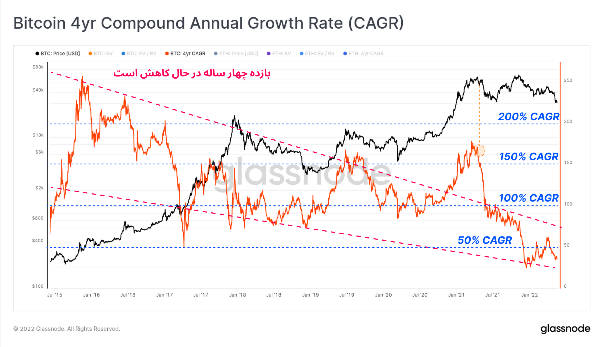 مشاهده میکنید که میزان CAGR در بلندمدت، از سال ۲۰۱۵، ۲۰۰ درصد بوده و بهتدریج کاهش پیدا کرده است که امروزه میزان آن به کمتر از ۵۰ درصد میرسد. همانطور که در نمودار مشخص شده و در هفته اول امسال به آن اشاره کردیم، سقوط بازده سالانه، همزمان با سقوط قیمتی ۲۰۲۱، بهاحتمال زیاد نقطه آغاز بازار خرسی بوده است.