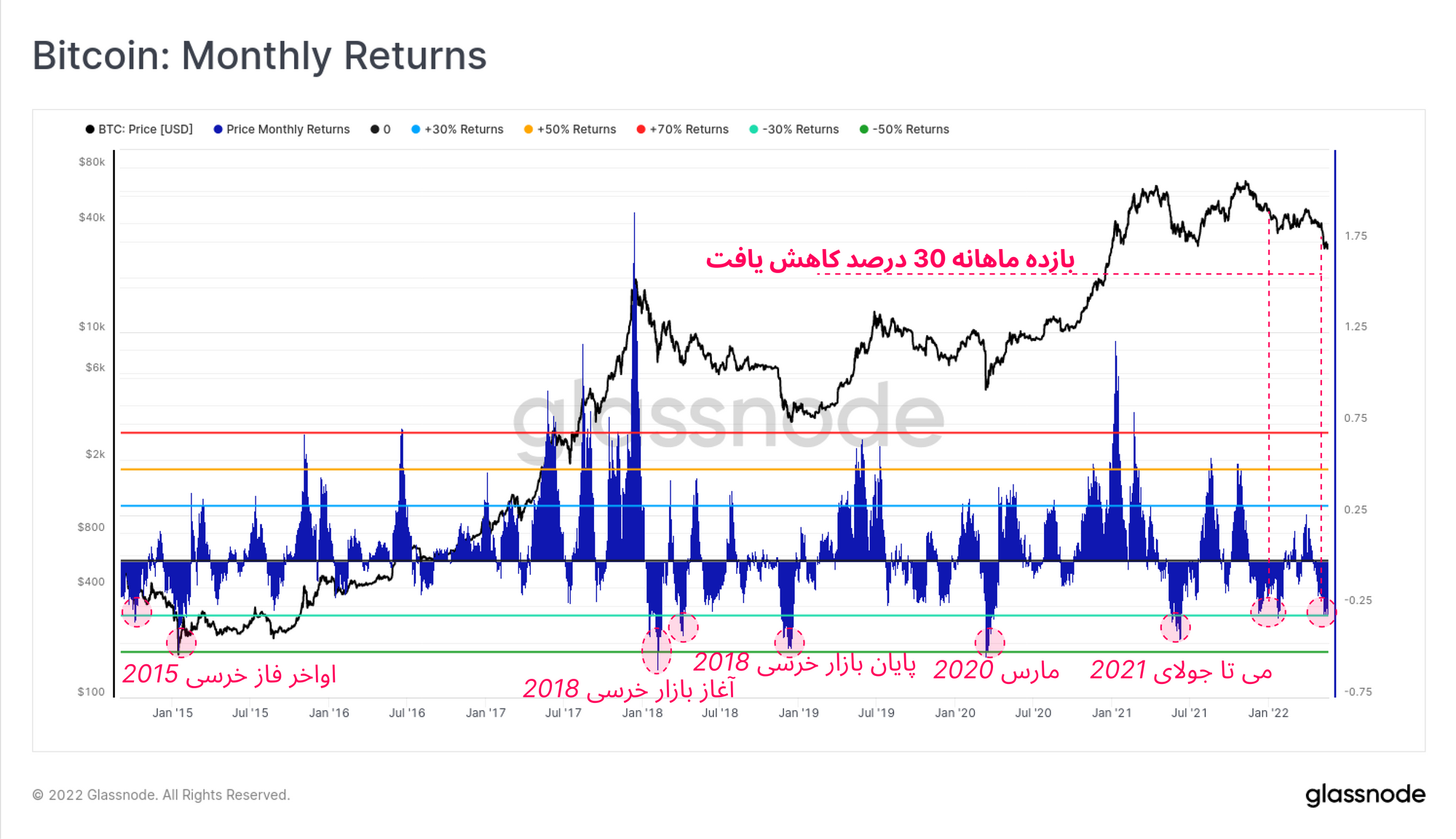 روند نزولی بازار به مدت هشت هفته متوالی ادامه پیدا کرده و این طولانیترین ردیف کندل قرمز هفتگی بود که بیتکوین تا کنون بهصورت متوالی تجربه کرده است.در این هفته، میزان بازدهی کوتاهمدت (ماهانه) و بلندمدت (۴ساله) بیتکوین و اتریوم را بررسی خواهیم کرد. پس از مشاهده بازدهی، خواهیم دید که چگونه سقوط قیمتی که اخیراً در بازار رخ داد، باعث شده است کل بازار کریپتوکارنسیها عملکرد ضعیفی پیدا کنند.