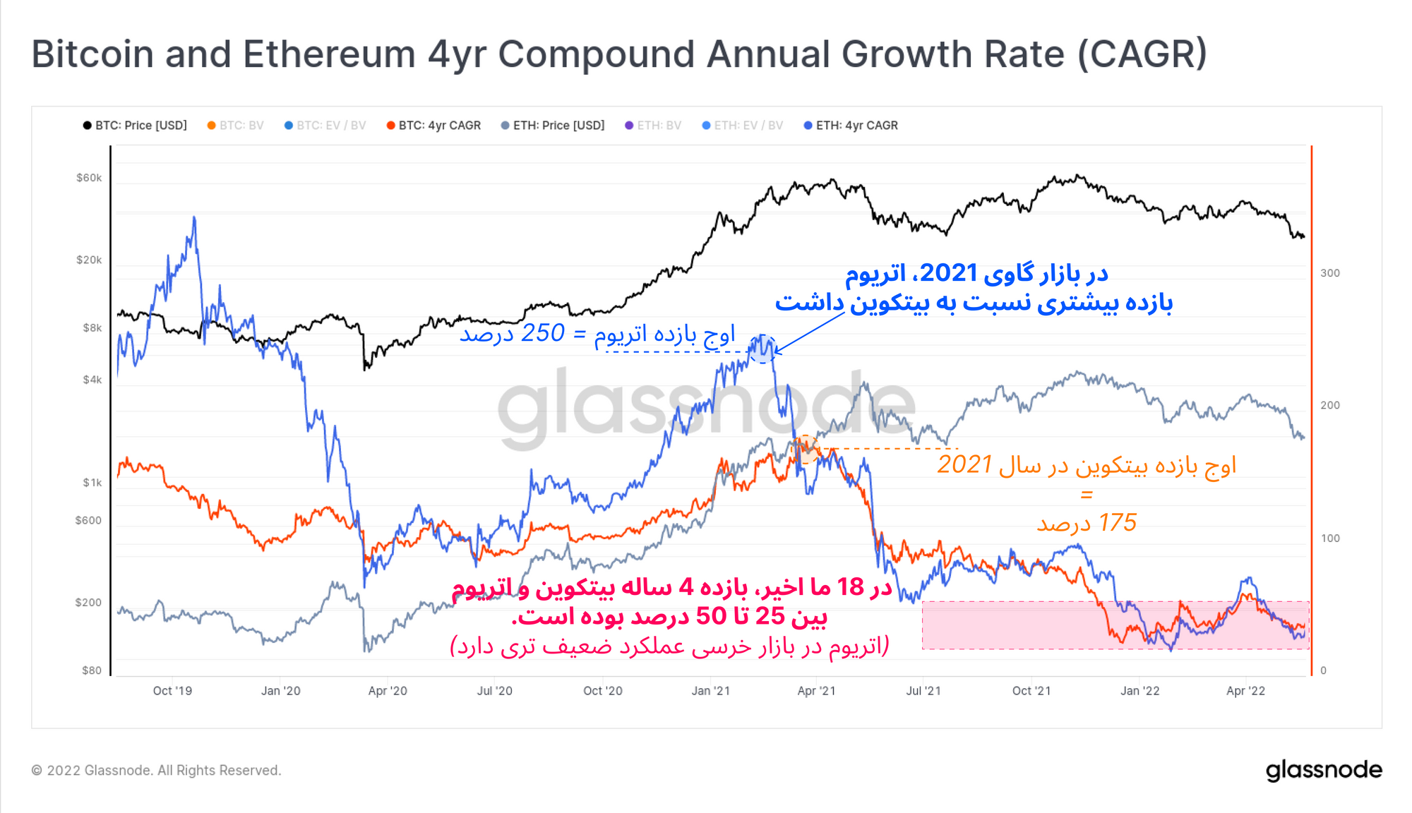 در نمودار زیر همبستگی جالبی میان بازده ۴ساله بیتکوین (نارنجی) و اتریوم (آبی)، بهخصوص در روندهای خرسی بازار مشاهده میکنیم. در دو نمونه، میان بیتکوین و اتریوم همگرایی ایجاد شده که روند بازده سالانه مرکب این دو دارایی را به یکدیگر نزدیک کرده است. اولین همگرایی، بعد سقوط مارس ۲۰۲۰ رخ داده است و دیگری از آغاز بازار خرسی ۲۰۲۱ تاکنون مشاهده میشود. بازده مرکب سالانه اتریوم نیز بهتنهایی باگذشت زمان کاهش پیدا کرده است.
