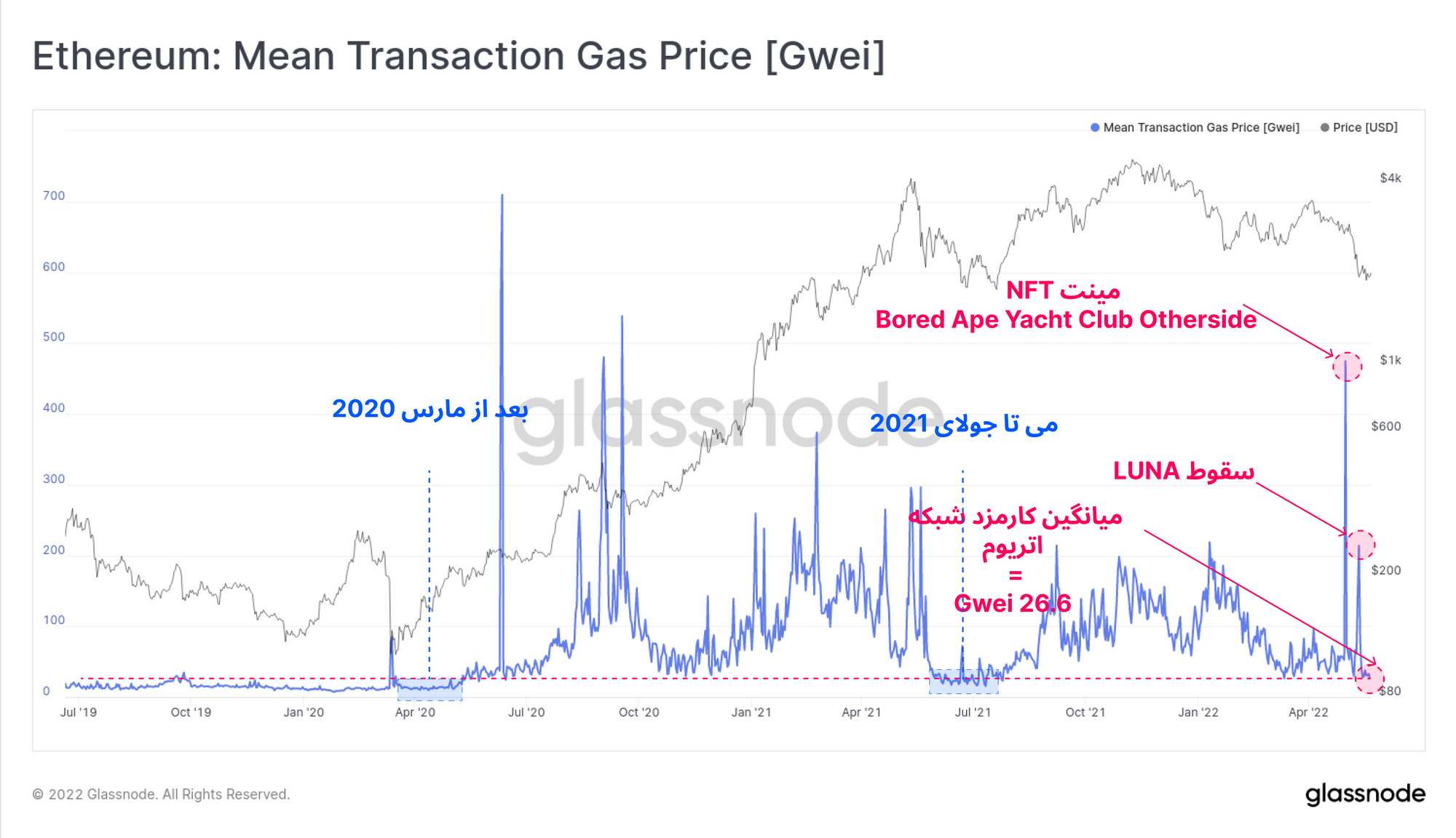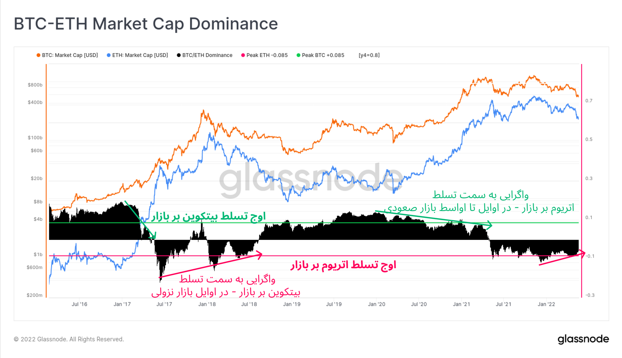 باتوجهبه دیدگاه منفی که در اثر نابودی LUNA و UST شکل گرفت، باید همچنان این روند را رصد کنیم. همچنین باید توجه داشت که Dominance اتریوم نسبت به سال ۲۰۱۸ برای مدتزمان طولانیتری بر بازار مسلط شده که این بیانگر رشد و بلوغ بازار اتریوم است.